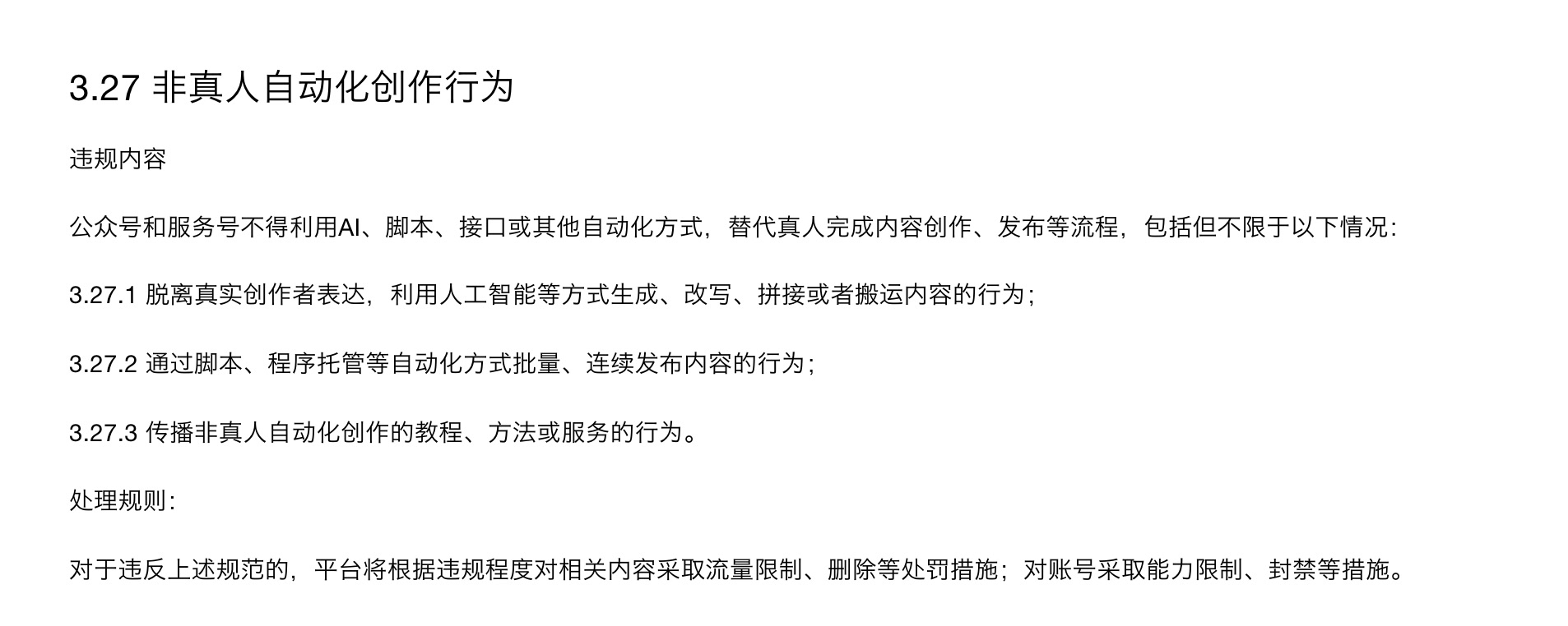 记者查阅发现,微信在“非真人自动化创作行为”中明确规定,以下内容属于违规:脱离真实创作者表达,利用人工智能等方式生成、改写、拼接或者搬运内容;通过脚本、程序托管等自动化方式批量、连续发布内容;传播非真人自动化创作的教程、方法或服务。违规者将面临流量限制、内容删除,以及账号能力限制、封禁等处罚。
