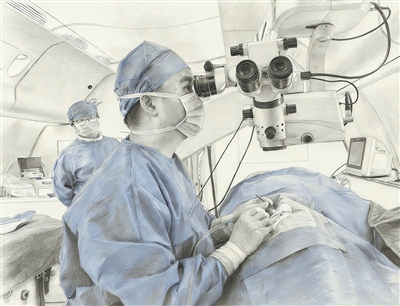 机舱手术室内正在进行眼科手术,AI修饰生成素描画