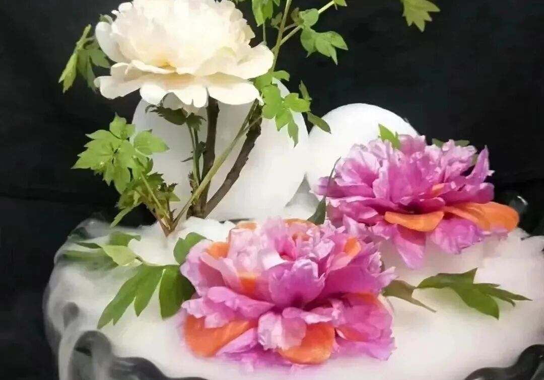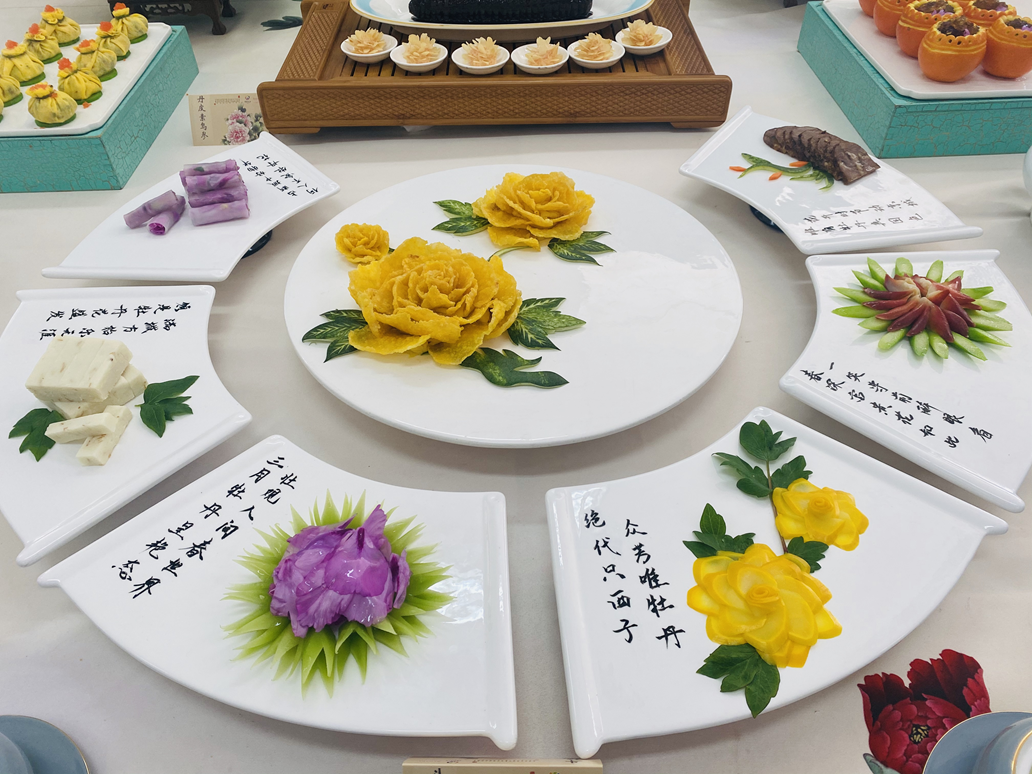 牡丹宴是菏泽各大餐饮酒店的招牌美食,厨师们巧手将牡丹花瓣、花粉、花蕊、花籽、牡丹根等融入菜肴,菜名以古人吟咏牡丹的诗句命名。