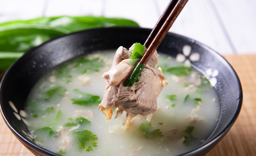 海家羊肉汤汤底呈现出一种浓郁的奶白色,质地稠密,仿佛能挂在勺边。