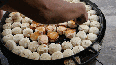 煎制前要先在平底锅刷油,将包子码得满满当当,煎到底部金黄后,淋入特调的面浆水,盖盖焖蒸,最后绕锅边淋上小磨香油。