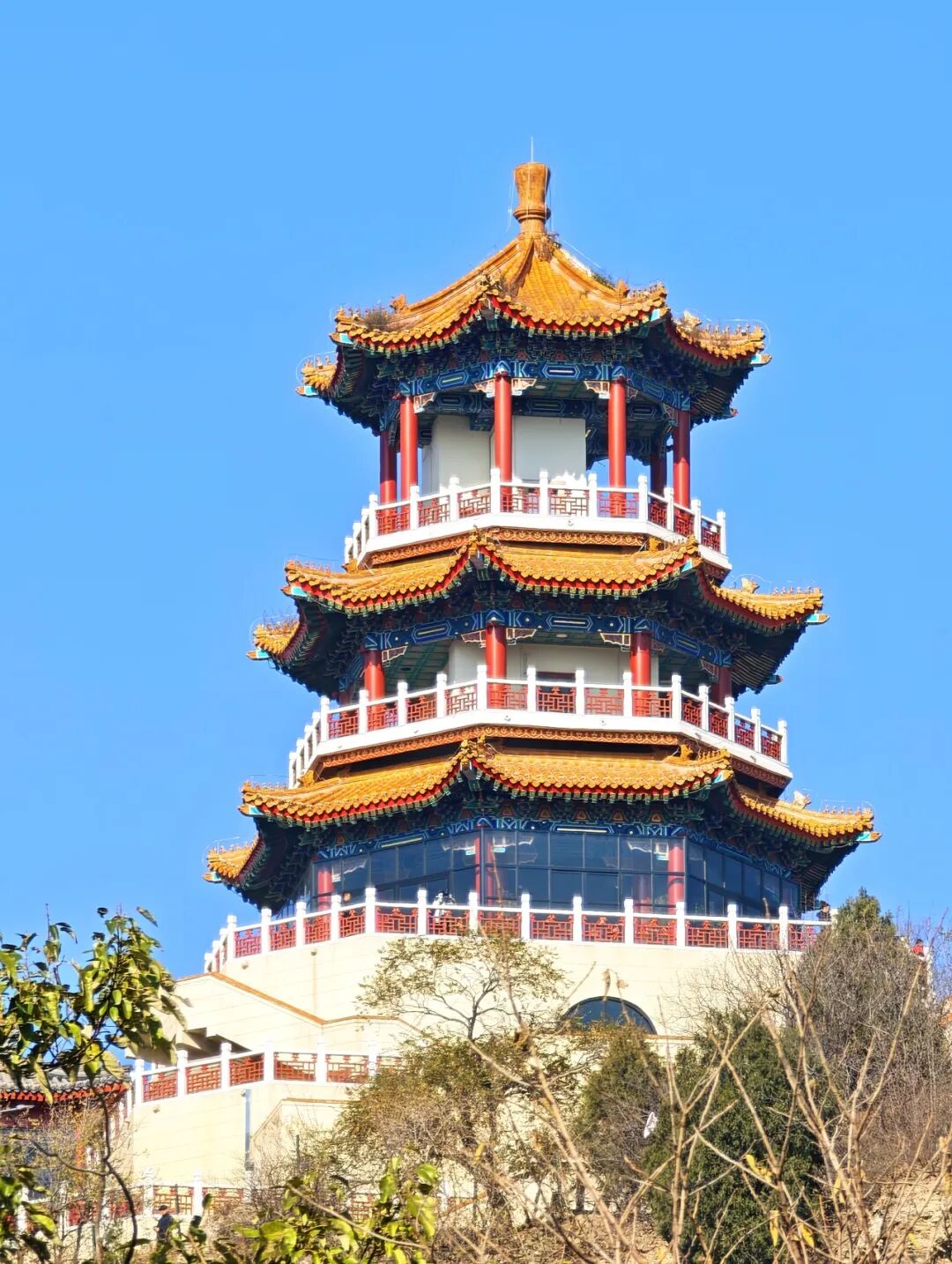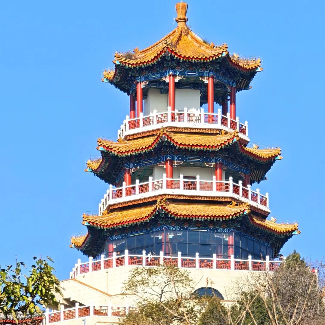 登临功碑阁,是这场漫步的最后一站,也是最开阔的一站。功碑阁矗立在高处,朱红的梁柱在蓝天白云的映衬下格外醒目。