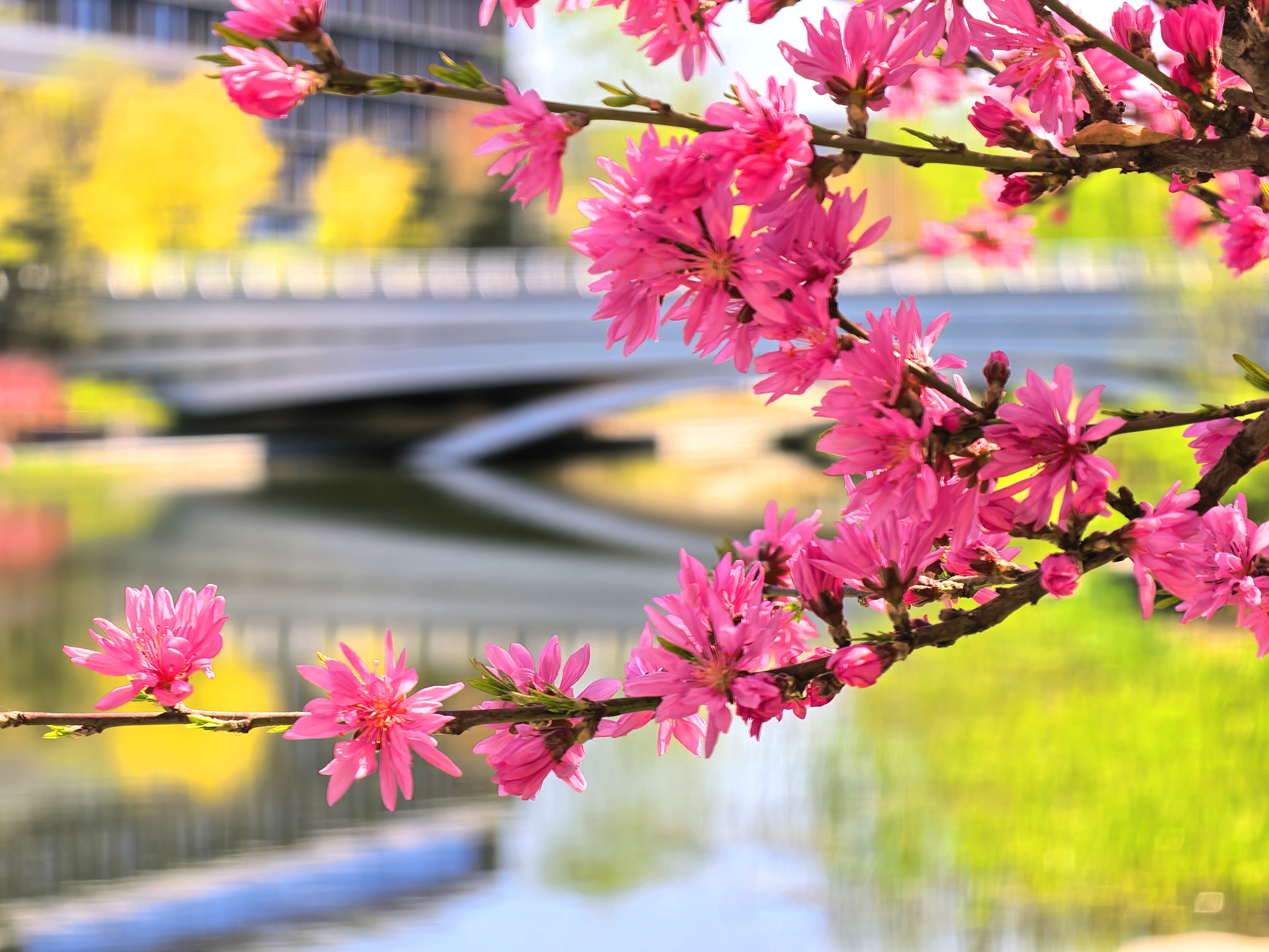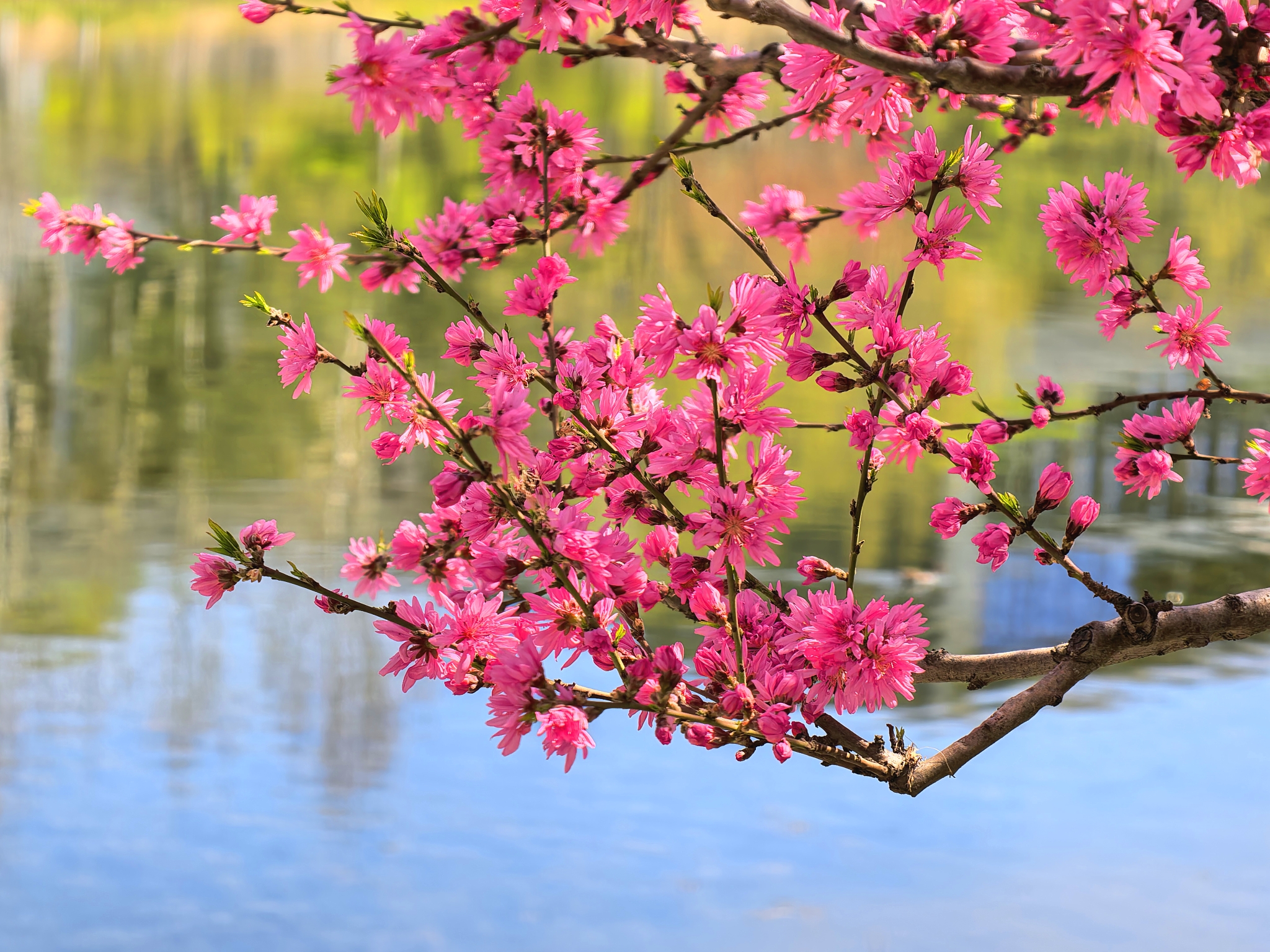 京城水岸波光轻漾,绿树、春花与白云,一一倒映水中,浑然天成一幅流动画卷。