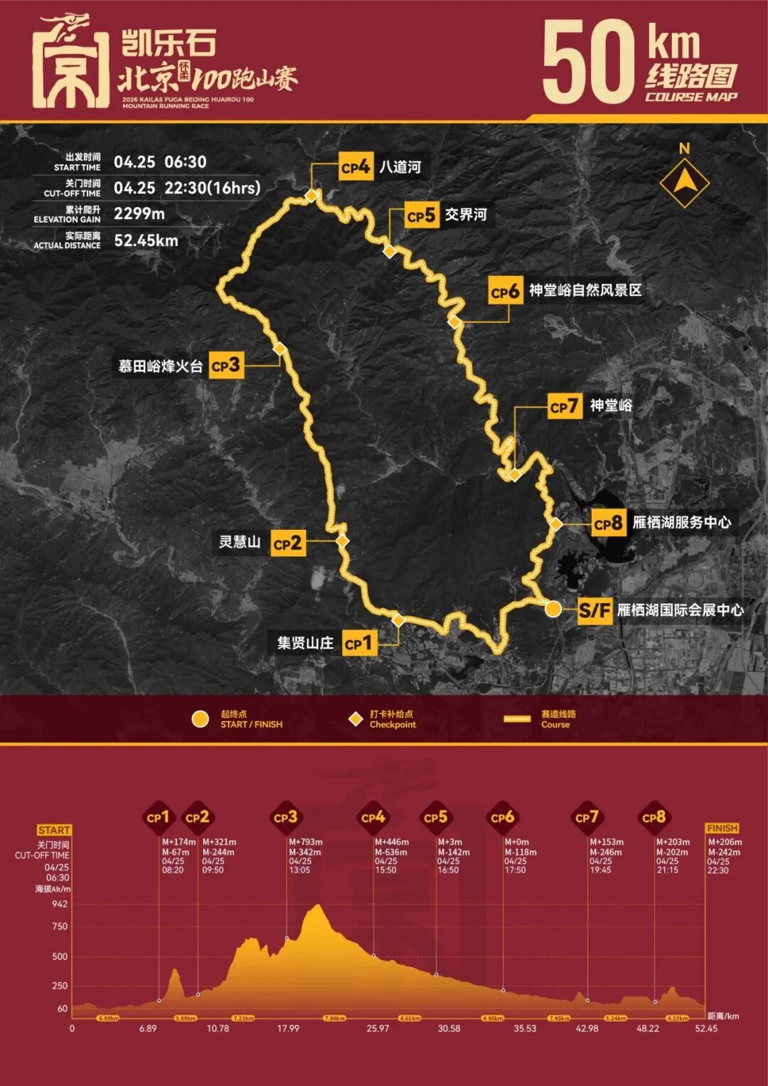 赛道串联怀柔十处自然与人文景观:雁栖晨光、红螺芦影、灵慧朝烟、慕田峪长城、摩崖石刻、九公望京、珍珠泉、篱苑书香、神堂龙潭、西山归雁。十处景观由100公里、50公里、35公里、13公里四个组别的路线共同串联呈现,其中精华景点集中体现在100公里和50公里组别中。参赛者将在不同赛段、不同时段依次经过这十处点位,在奔跑中沉浸式感受怀柔山水与文化交织的双重魅力。