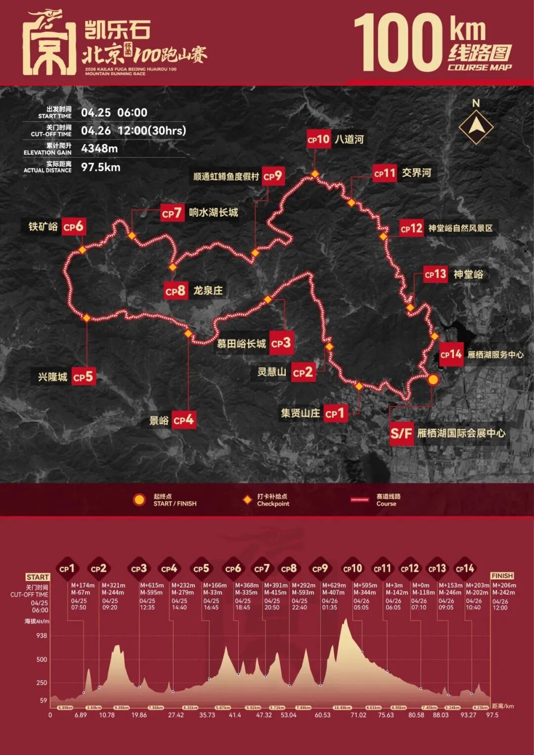 100公里:途经慕田峪长城,远眺箭扣长城,累计爬升4700米,为进阶跑者打造的长距离耐力挑战。