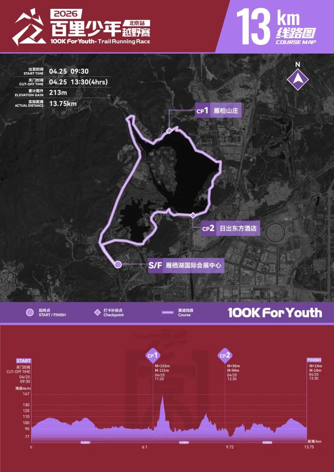 13公里(百里少年):专为青少年设计的越野入门组别,距离适中,安全可控,让孩子们在雁栖湖边感受奔跑的乐趣与成就感。