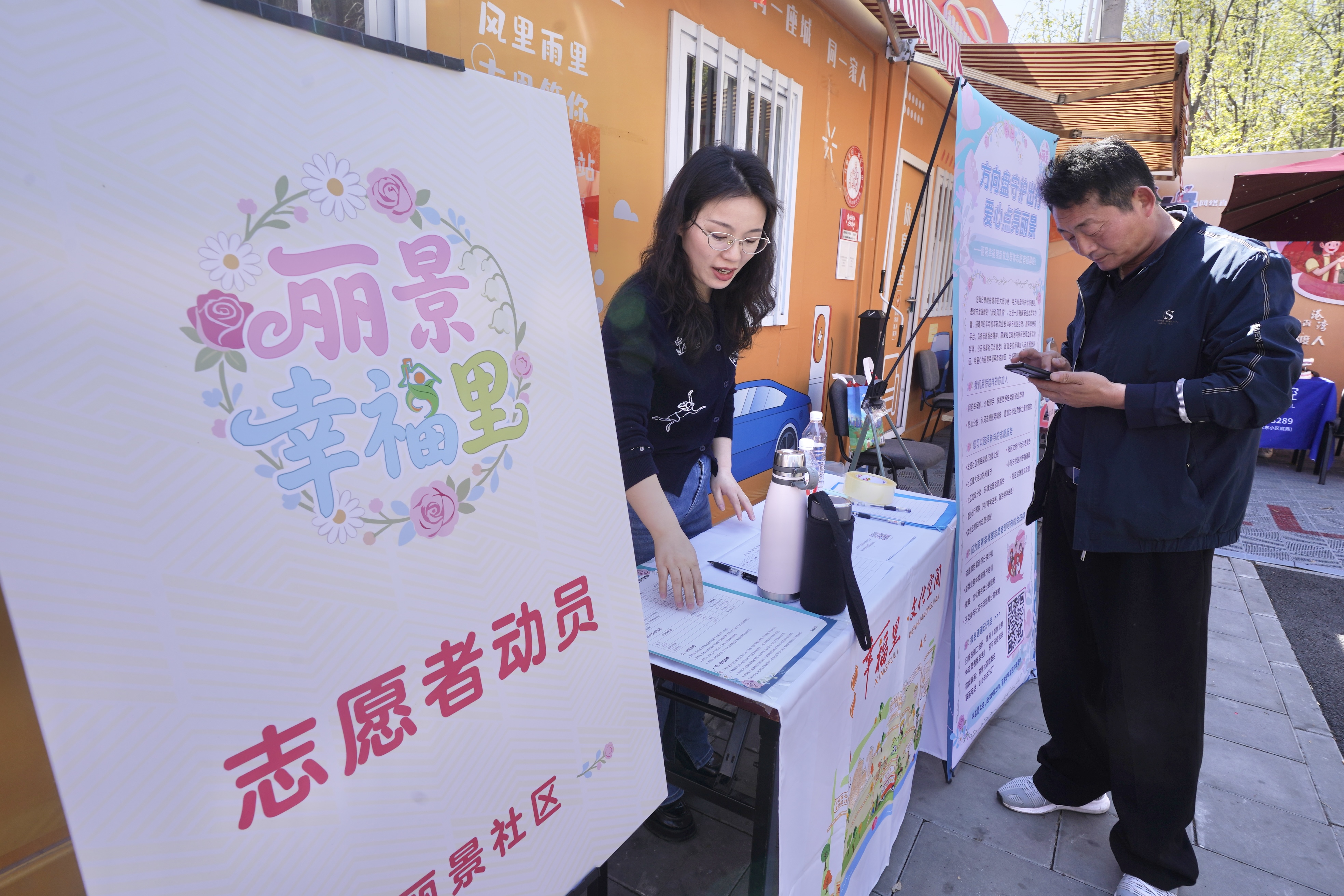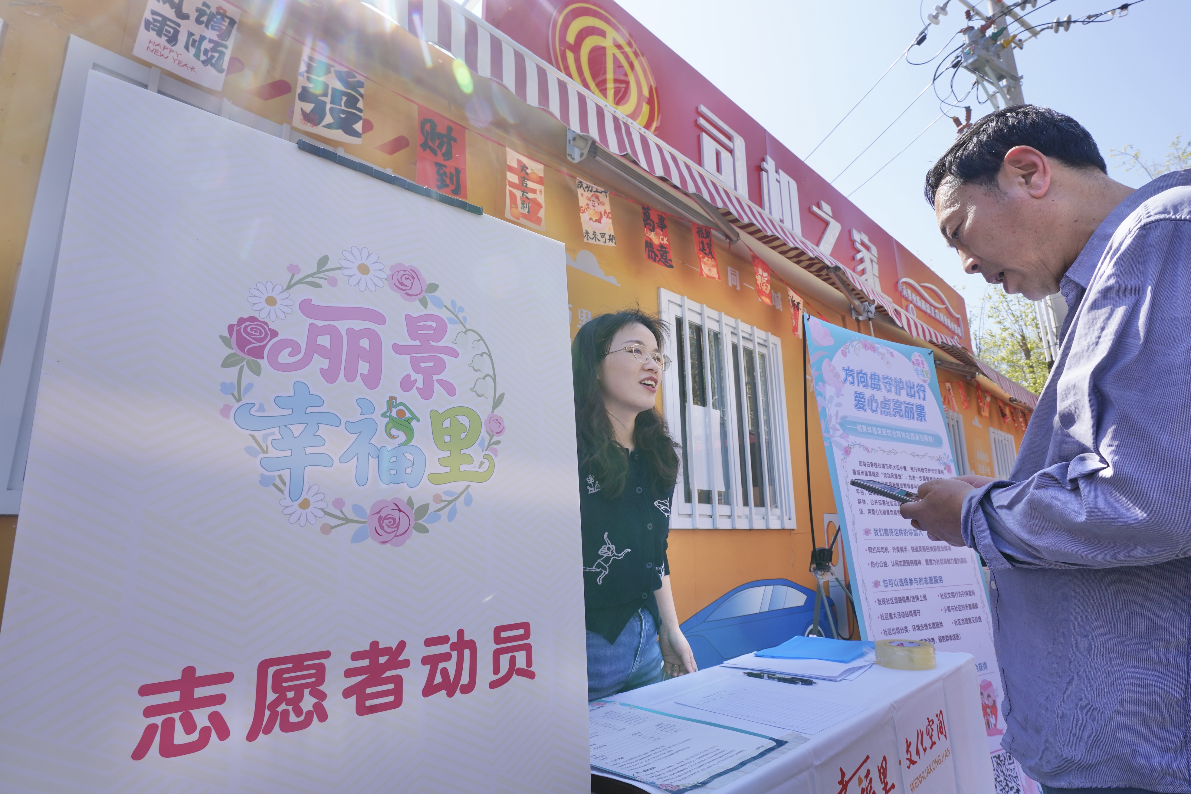 此次活动的一大创新亮点是推出专门面向新就业群体的志愿者积分机制。社区工作人员在司机之家及南侧道路设置显眼的志愿者招募点,通过展架海报详细介绍积分激励兑换规则。据现场工作人员介绍,现场扫码报名成为志愿者即可得1积分,还能领取小礼品。日常参与文明劝导、环境整治、应急值守等活动,都能获得相应积分,积分可兑换洗车券、用餐券、保温杯等实用物品。创新机制有效地激发了新就业群体的参与热情。