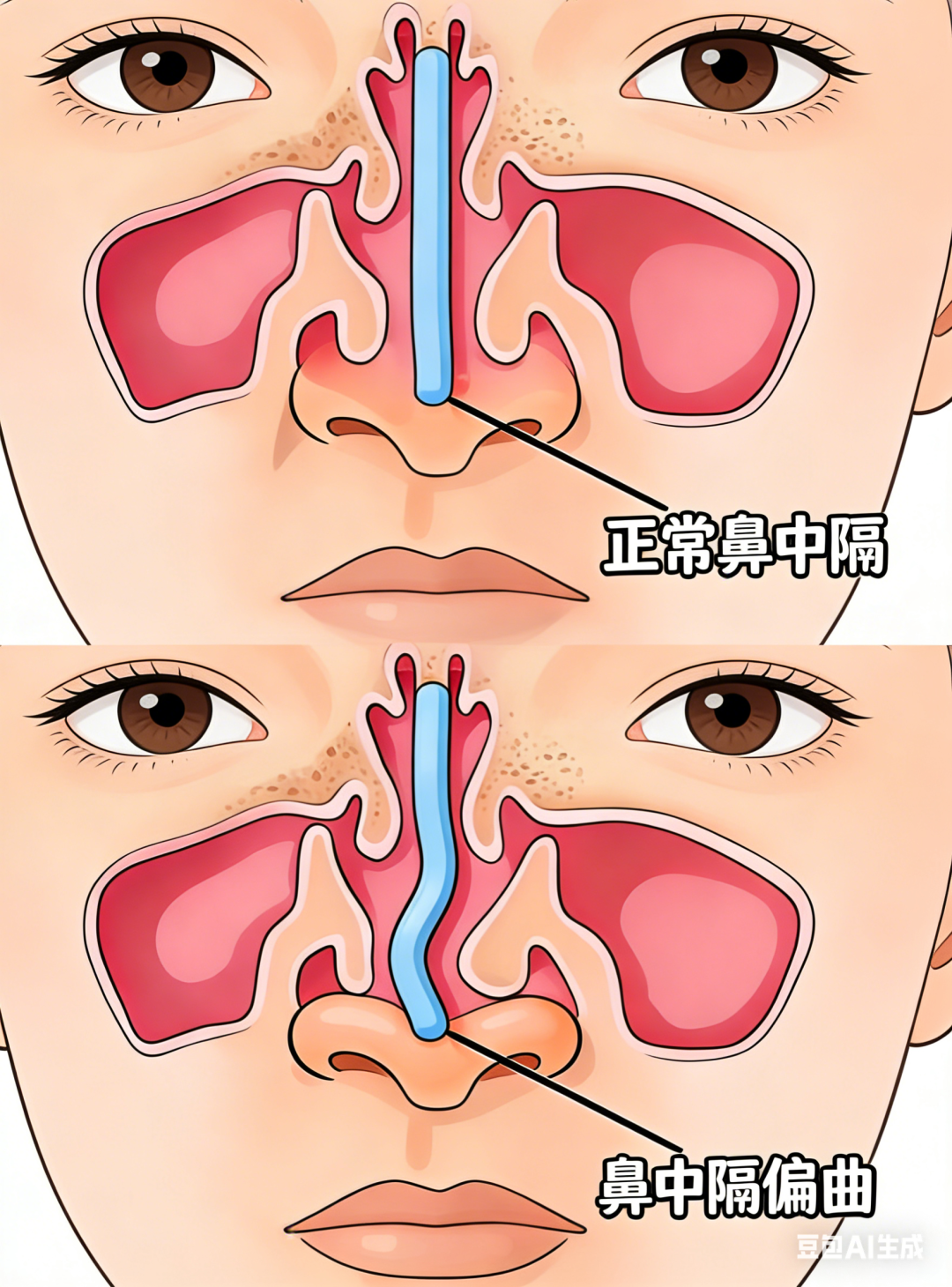 鼻中隔偏曲,就是这块隔板不直、偏向一侧,或呈 C 形 / S 形弯曲、局部突起,导致两侧鼻腔不对称。