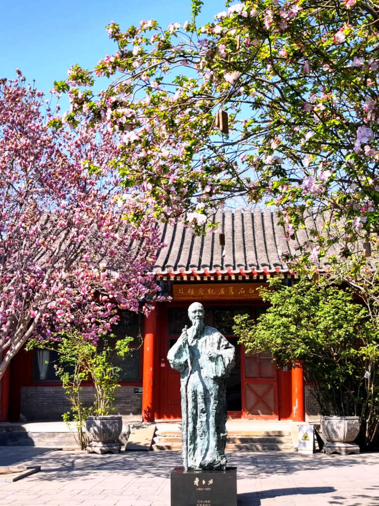正房墙上悬挂着齐白石亲笔篆书联语:“大福宜富贵,长寿亦无疆”。东西厢房改为生平与艺术展室,陈列画作高仿复制品与图片文字展板。院中矗立着齐白石铜像,由著名雕塑家吴为山创作。走进这座四合院,仿佛能触摸到一位艺术巨匠的生活温度。