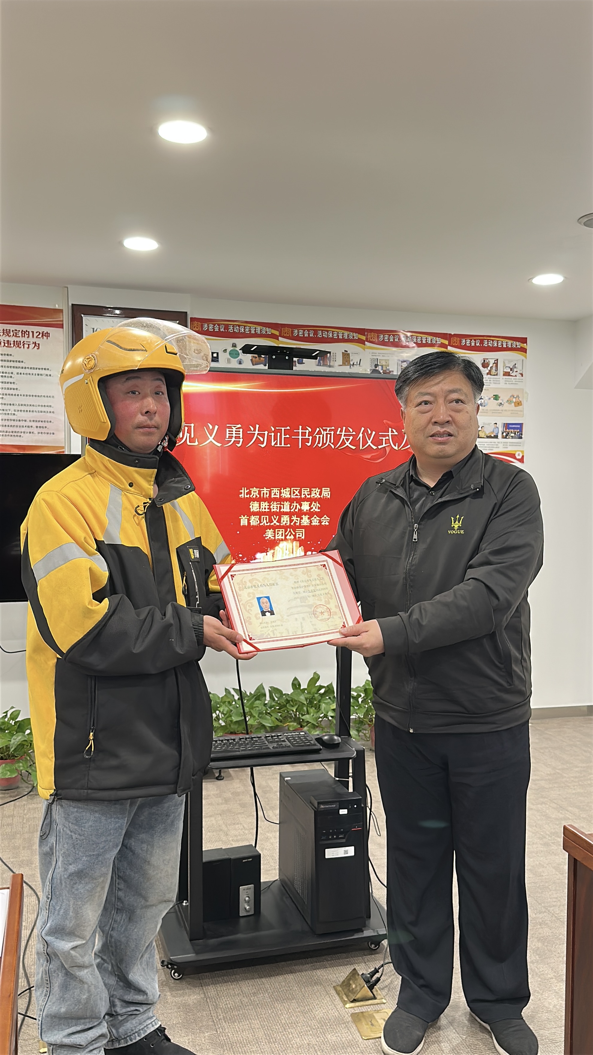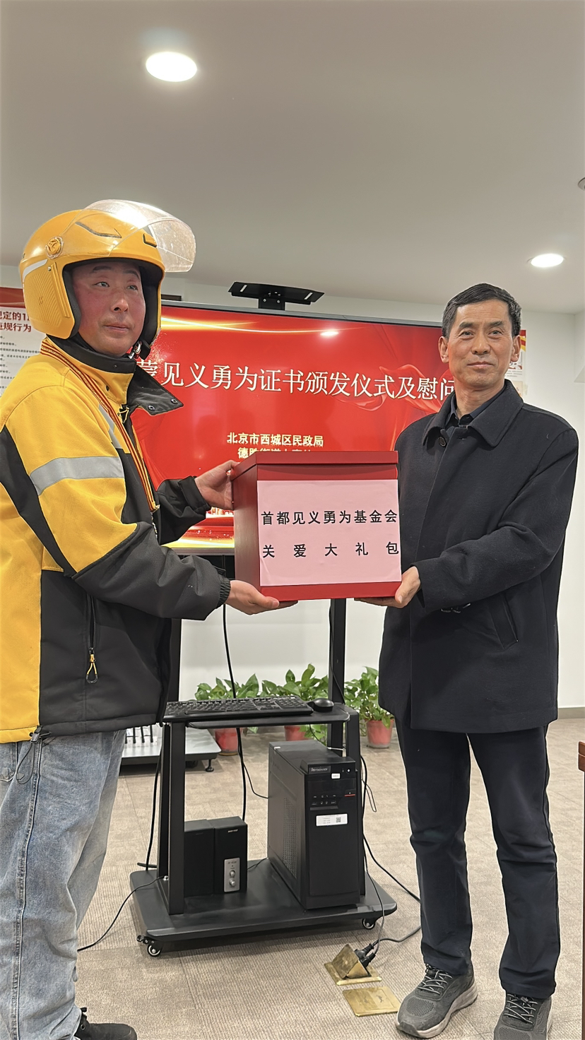 4月10日下午,西城区民政局为跳河救人的外卖骑手张蒙蒙颁发见义勇为证书和奖章。今年春节前夕,积水潭桥北侧一名女子溺水,送餐途中的张蒙蒙果断停车跳河救人。事发后,民政部门迅速开展工作,依法认定张蒙蒙的举动为见义勇为行为。