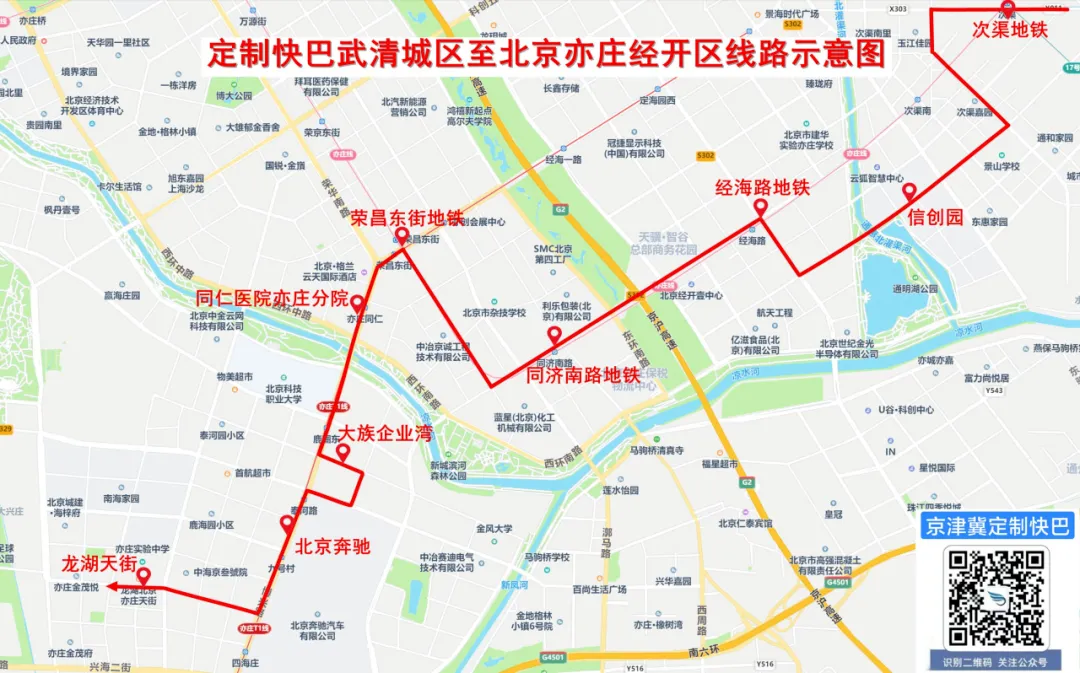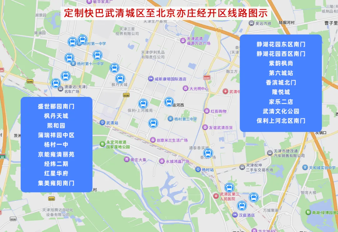 这条新增定制快巴从天津武清静湖花园站至北京亦庄龙湖天街站。