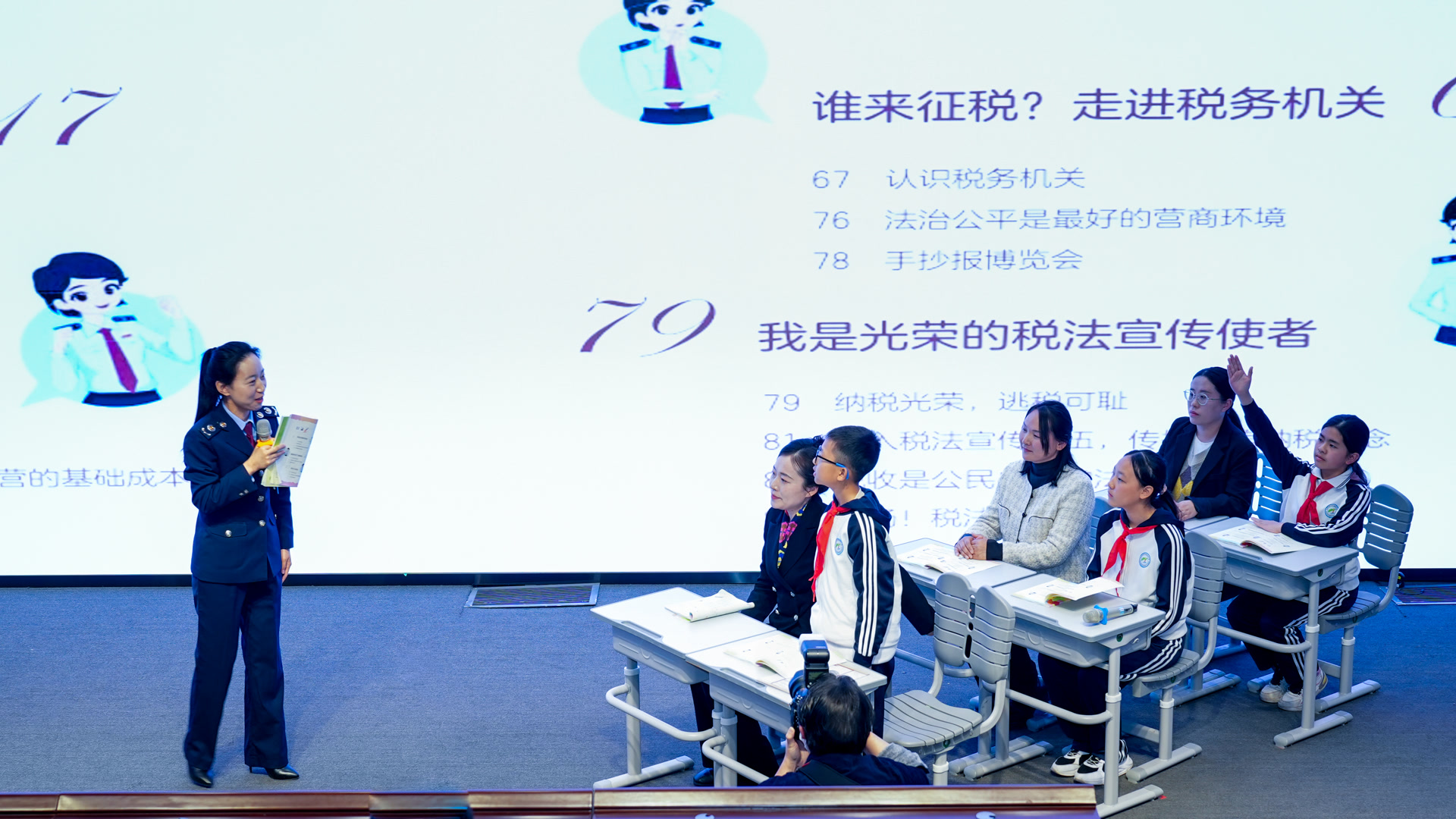 在共学法治文化环节,密云区少年税校讲师依托《我的税收第一课》普法读本,围绕书中六大章节,以生动的案例和贴近生活的讲述,将税收化身为滋养民生的源头活水。从家门口的学校到身边的医院,从宽阔的马路到整洁的公园,税收如同一股无声的力量,悄然守护着每个人对美好生活的向往。现场还特别设置了互动环节,学生家长与代表踊跃发言,在对话中深化对“税收、法治、公平”的理解。