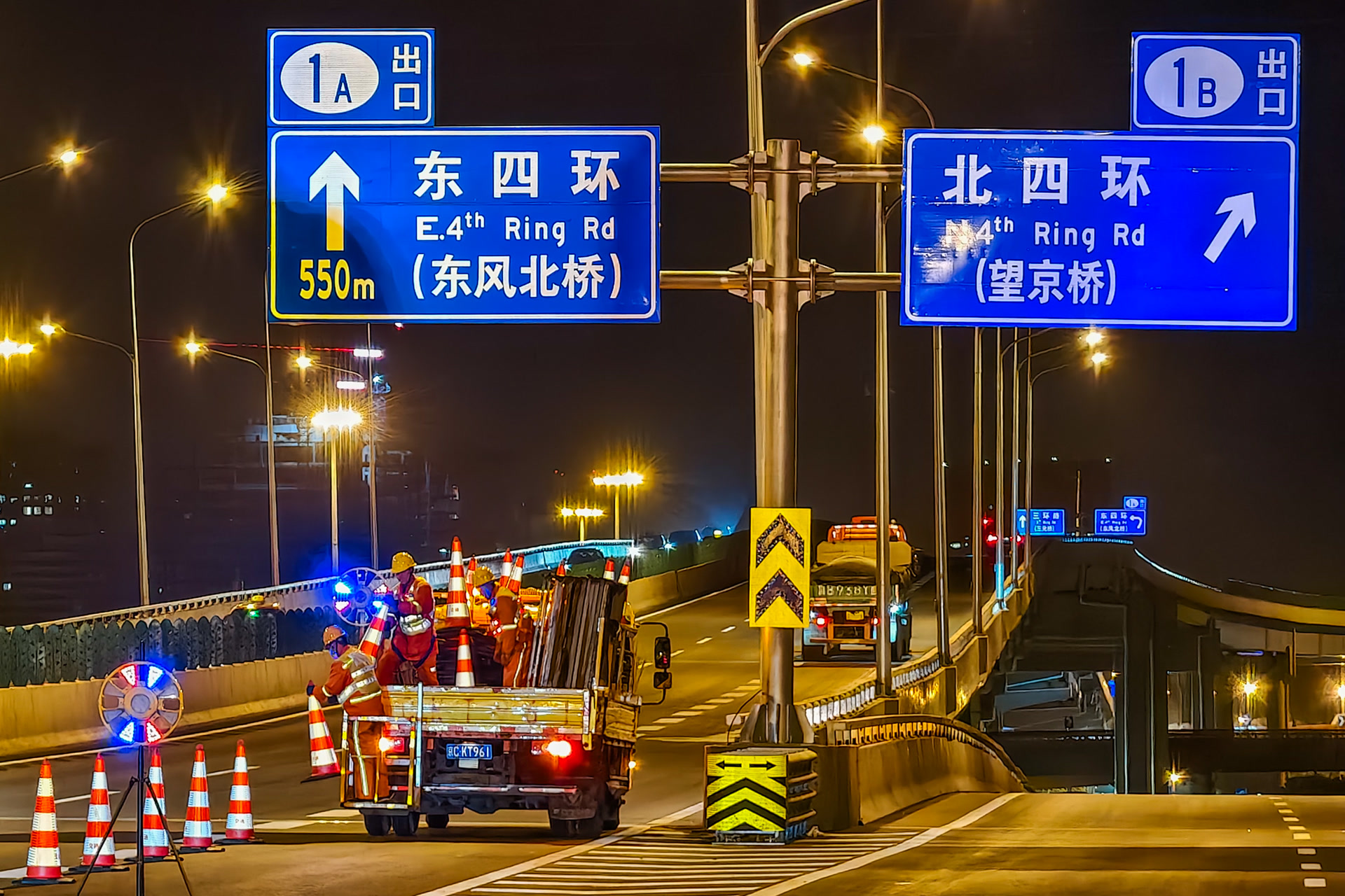4月11日零点刚过,在京密快速路连接四元桥的两条匝道桥上,随着工作人员导行车辆,出入口封闭,一支由大约300台套机械设备组成的车队缓缓驶入,原本寂静的桥面瞬间热闹起来,周末48小时内,作为四环桥系修复“手术”的第一阶段工程,两条匝道桥将火速完成翻新。