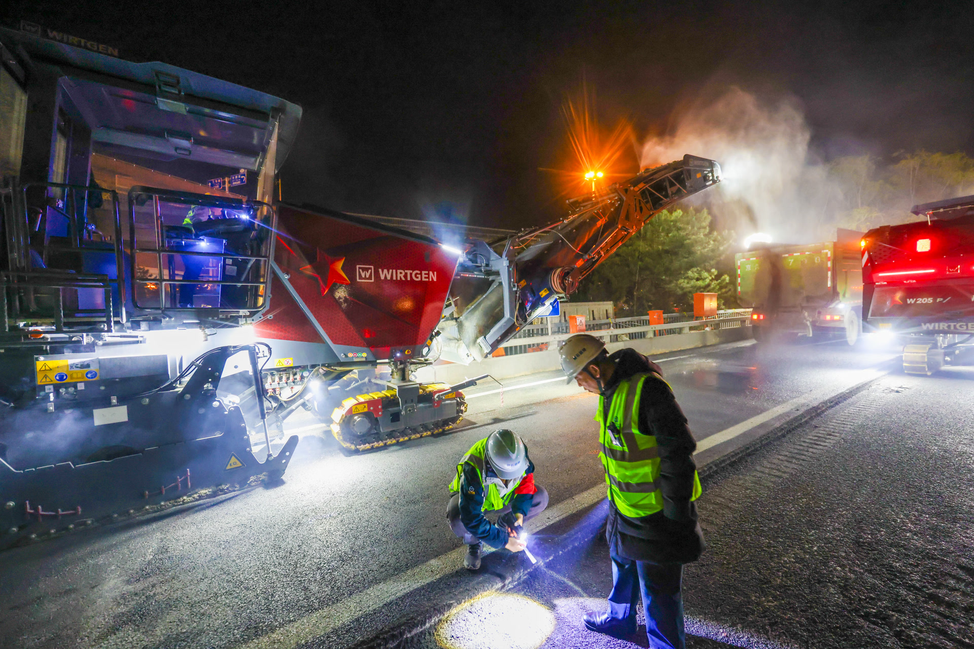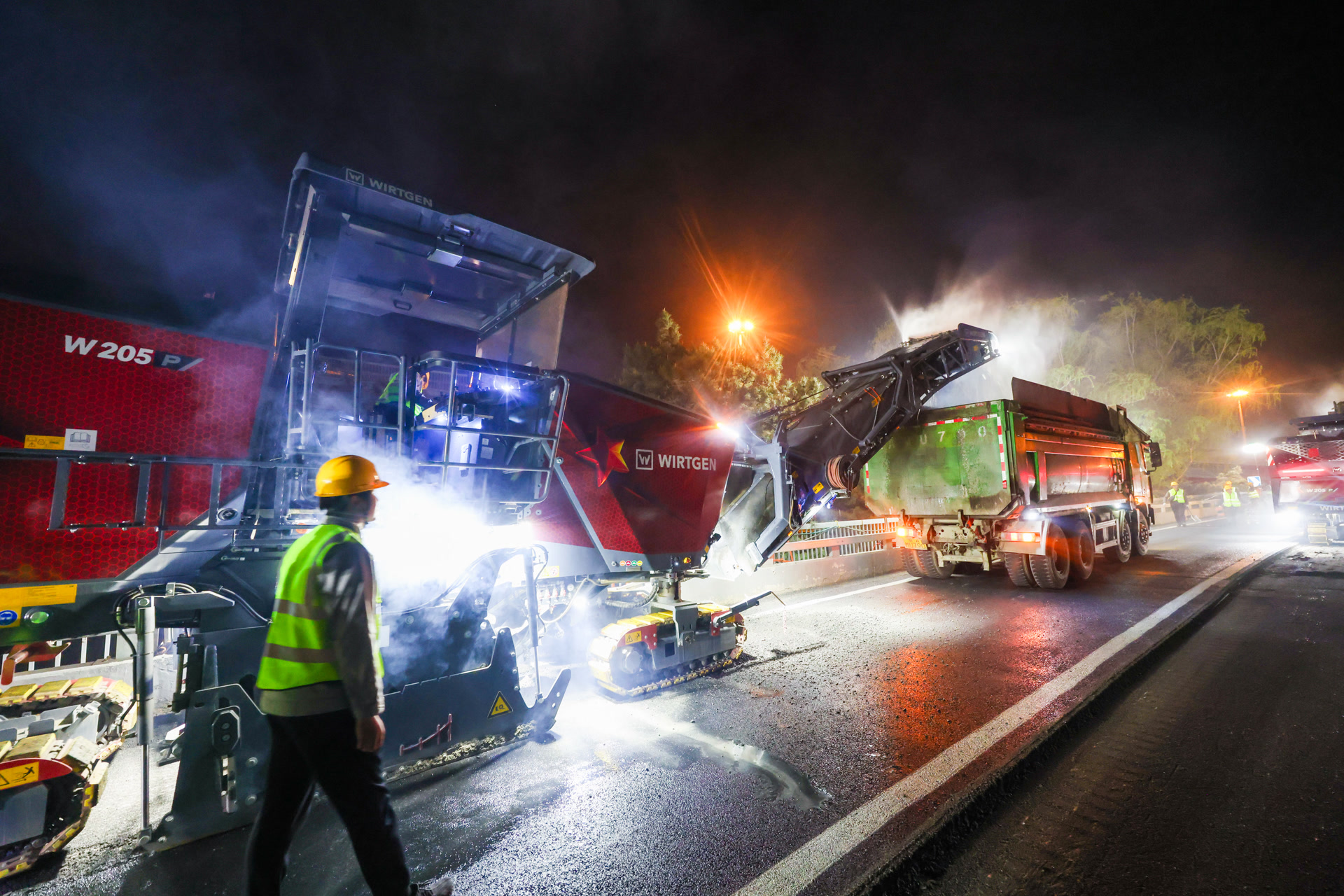 零点封路的指令下达后,一辆辆大型机械设备从集结点驶来,进入匝道桥施工路段。由于桥面空间有限,只能容纳两辆渣土车并行,每辆渣土车后紧跟着一台大型铣刨机。随着铣刨机车底的刀盘高速转动,老旧的路面立刻被均匀地“啃掉”10厘米厚度。与此同时,啃食掉的渣土通过高耸的传输装置,迅速传导到前方的渣土车上。