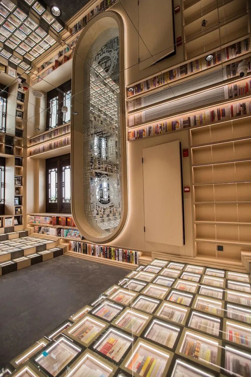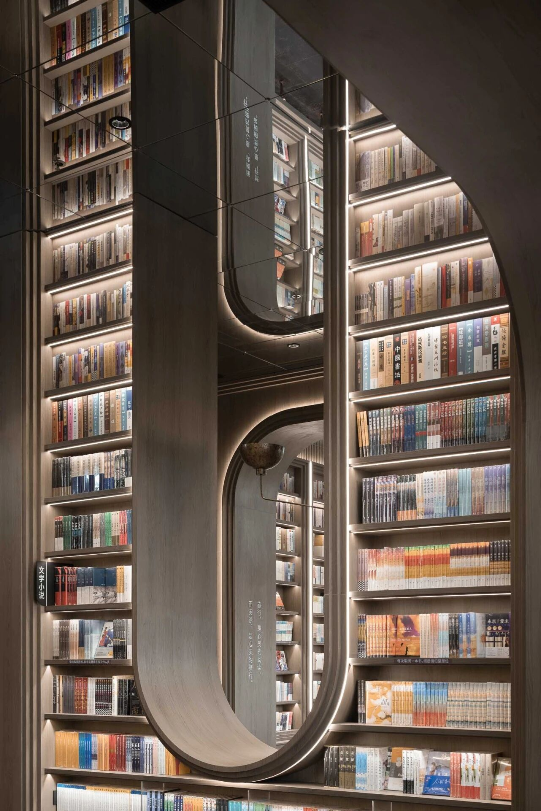钟书阁一楼中庭的镜面书架是绝对的打卡C位,对称的结构搭配穹顶倒影,书墙层层延伸,仿佛踏入无边书海,有种现代版“藏经阁”的幽静深邃。