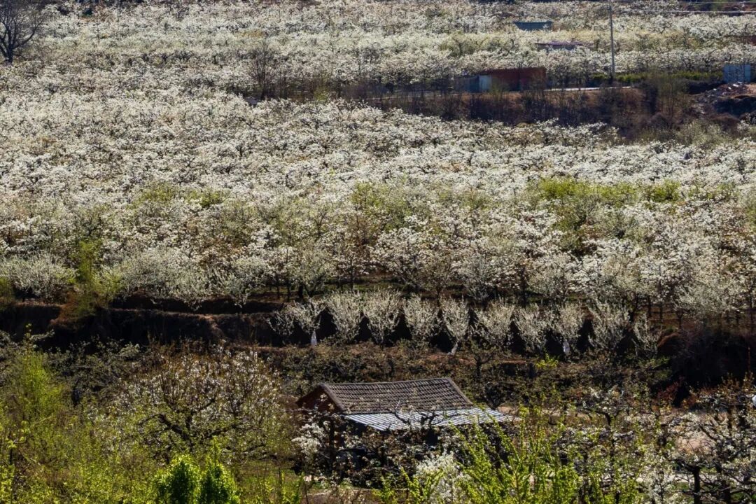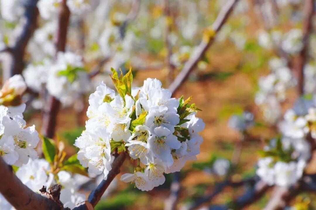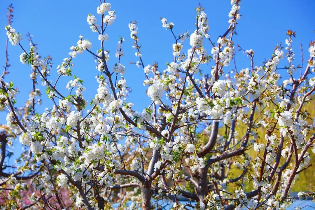 露天种植的樱桃园里,樱桃花也正开得烂漫。它们与梨花的气质不同,更显娇憨,预告着一个月后,另一场甜蜜的丰收。