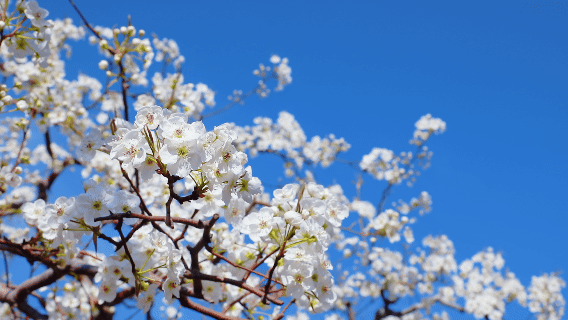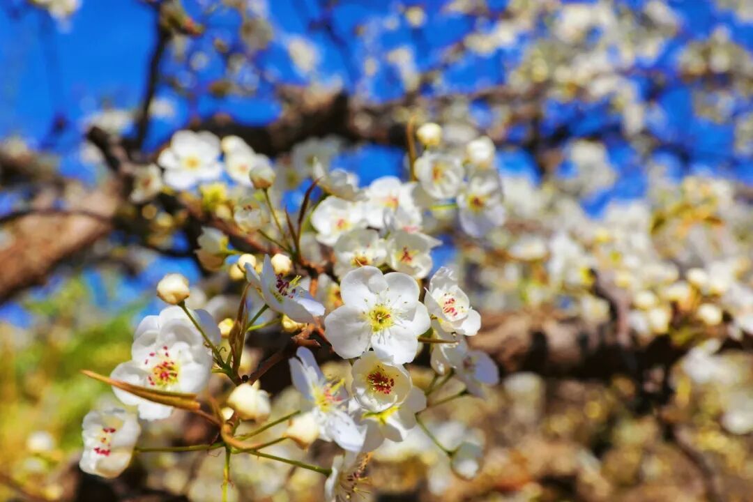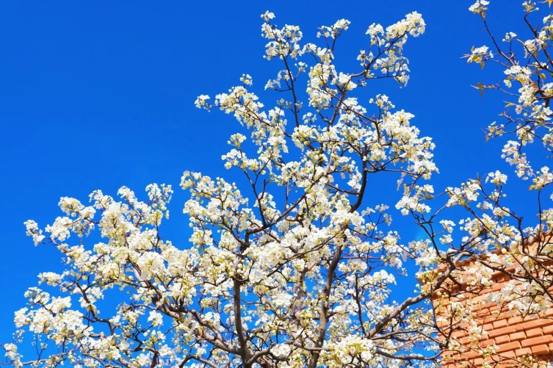 走近了看,每朵梨花都像是用宣纸精心剪裁而成,五片花瓣舒展着,透着光,羞怯而清新。风一动,整片园子便漾起柔软的波,花瓣偶尔离枝,旋舞着落下,空气里浮动着清冽的甜香,不浓,却足以染透衣襟与呼吸。