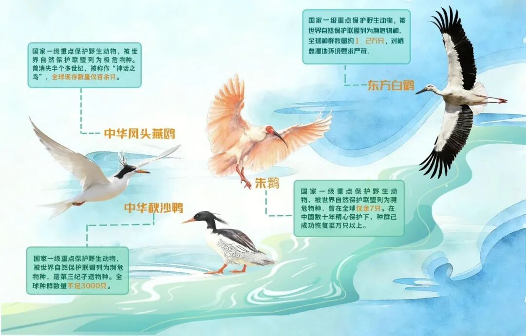 这些固定路线是候鸟历经漫长演化得出的“最优解”。我国西高东低的地形是天然地理屏障,候鸟难以持续飞越极寒、缺氧的高山地带,只能沿河谷、垭口绕行;与此同时,从东部的滨海湿地(如渤海湾、崇明岛),到中部的长江中下游湖泊群(如鄱阳湖、洞庭湖),再到西部的高原湖泊(如青海湖),一系列食物丰富、栖息条件优越的“能量驿站”呈带状分布,吸引候鸟汇聚于固定路径。