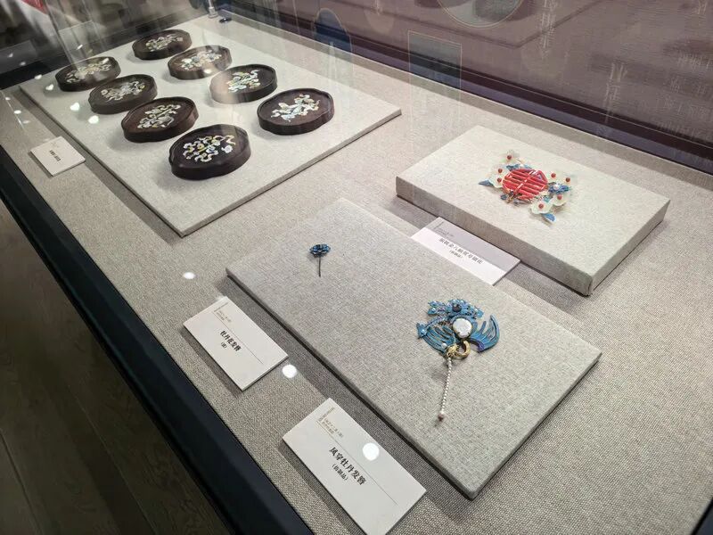 与此同时,“屏影惊鸿——雍正十二美人图岁时雅韵展”在圆明园博物馆最上楼二层开展。《胤禛十二美人图》原陈设于圆明园深柳读书堂围屏,画中人物品茶、观书、赏蝶、对镜,衣饰纹样精巧细致,暗八仙、缠枝莲、福寿纹等尽显清代工艺之美。本次展览通过1:1非遗复原美人服饰与配饰,历经半年考据复刻,完整还原画中衣纹、发饰、首饰细节,点翠步摇、福寿发簪、莲花耳饰等十余件复刻首饰同步展出,让观众近距离领略清代宫廷美学的精湛匠心。