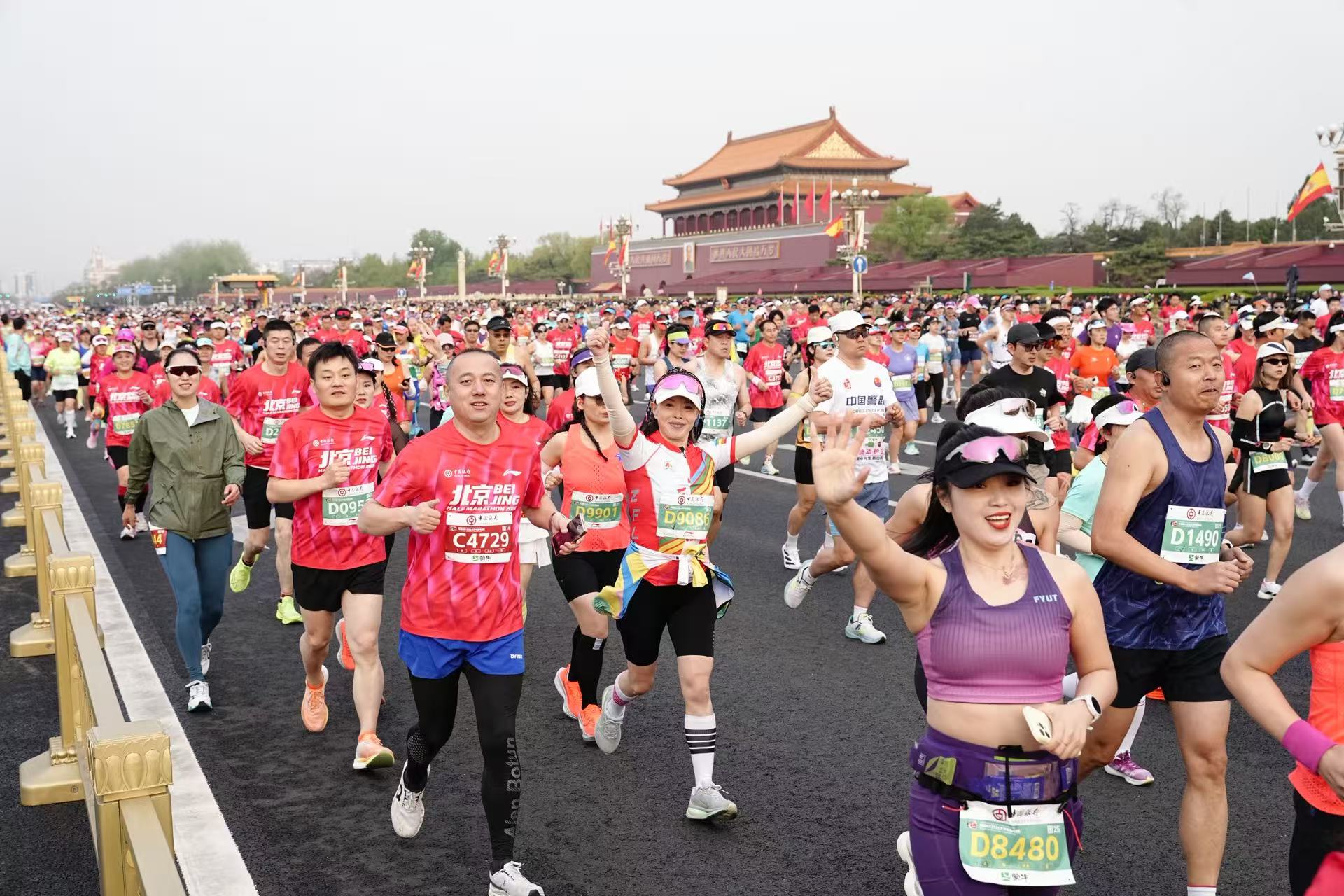 早上7时,22000名跑者在天安门广场出发。参赛人数较去年增加10%,出发时间比去年提前了30分钟,关门时间为10时整。两项改变显现了赛事细化的提升,一方面满足了更多跑者的参赛需求,另一方面减少了赛事对社会交通的影响。
