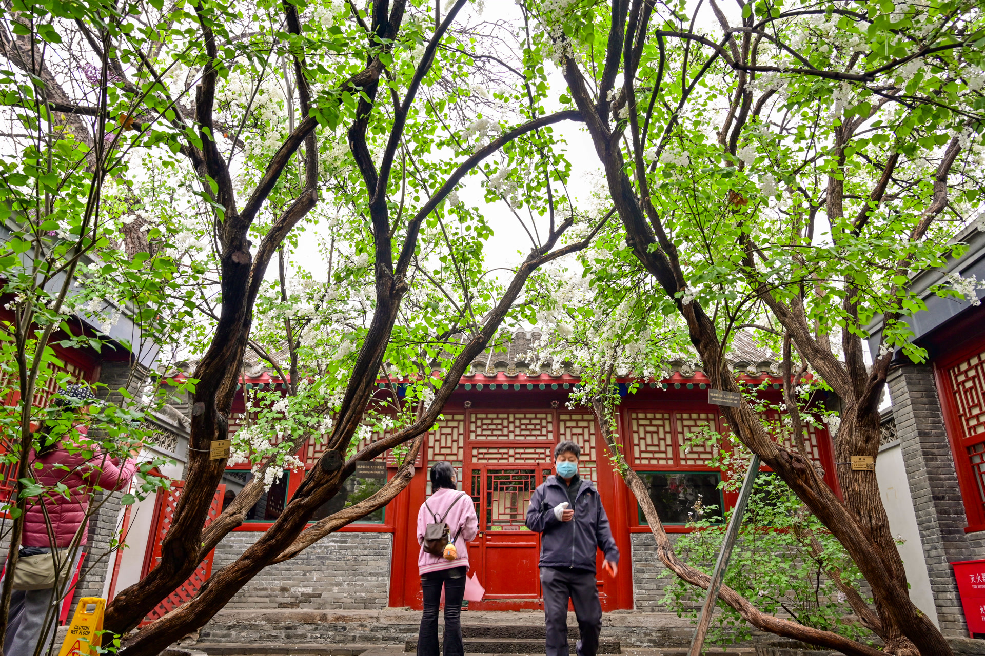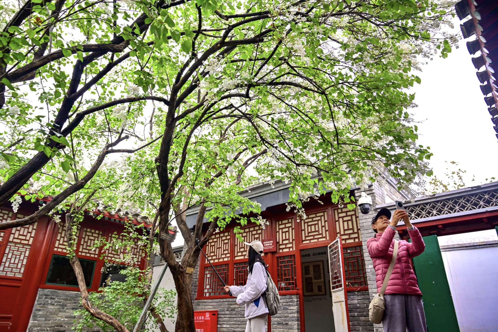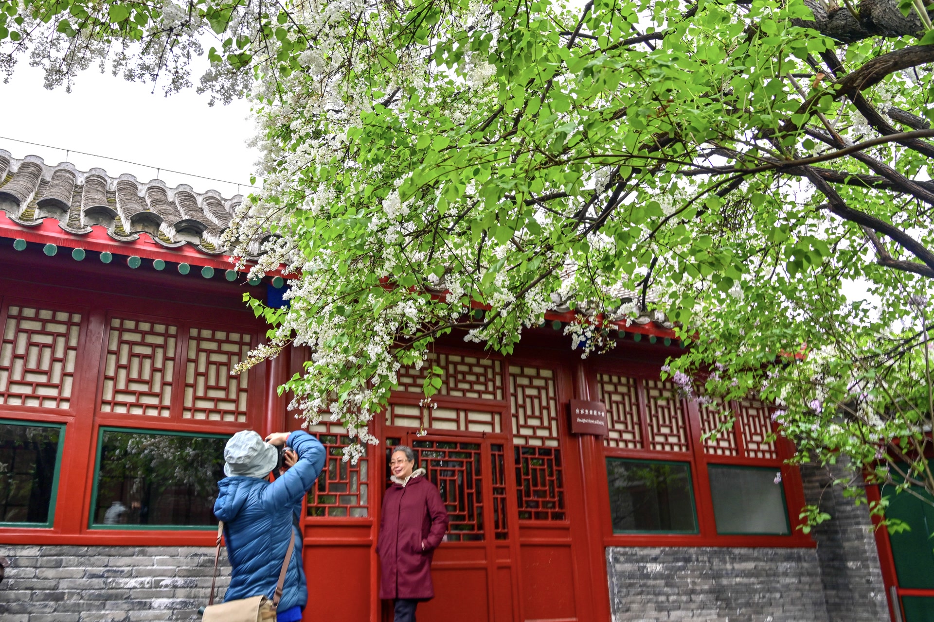 鲁迅旧居浸在清甜的花香里,屋檐上缀满细密的白色丁香花,吸引很多观众放慢脚步,举起手机和相机,定格春色。这两株白丁香是鲁迅1925年4月5日亲手所植。他在日记中写下:“云松阁来种树,计紫、白丁香各二,碧桃一,花椒、刺梅、榆梅各二,青杨三。”