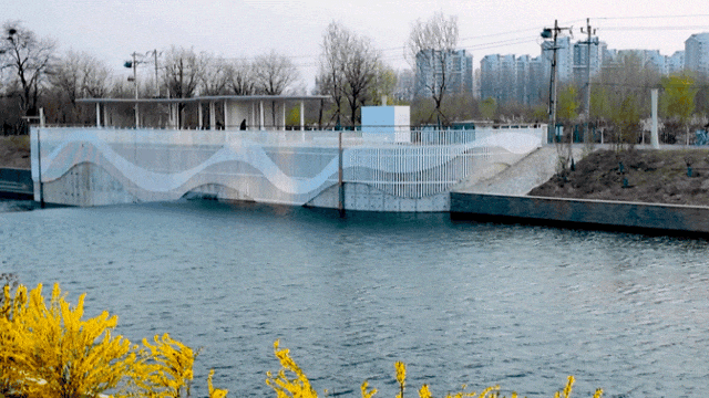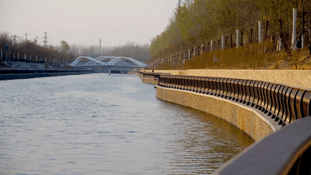 约4.5公里的河道已完成改造,骑行道、跑步道、散步道分层而设。路旁连翘金黄、桃花粉艳、柳枝嫩绿,色彩热烈却不张扬。骑行至此,不妨在沿途座椅小憩,再骑行三五分钟即可到达中粮·祥云小镇,买一杯咖啡,惬意自来。