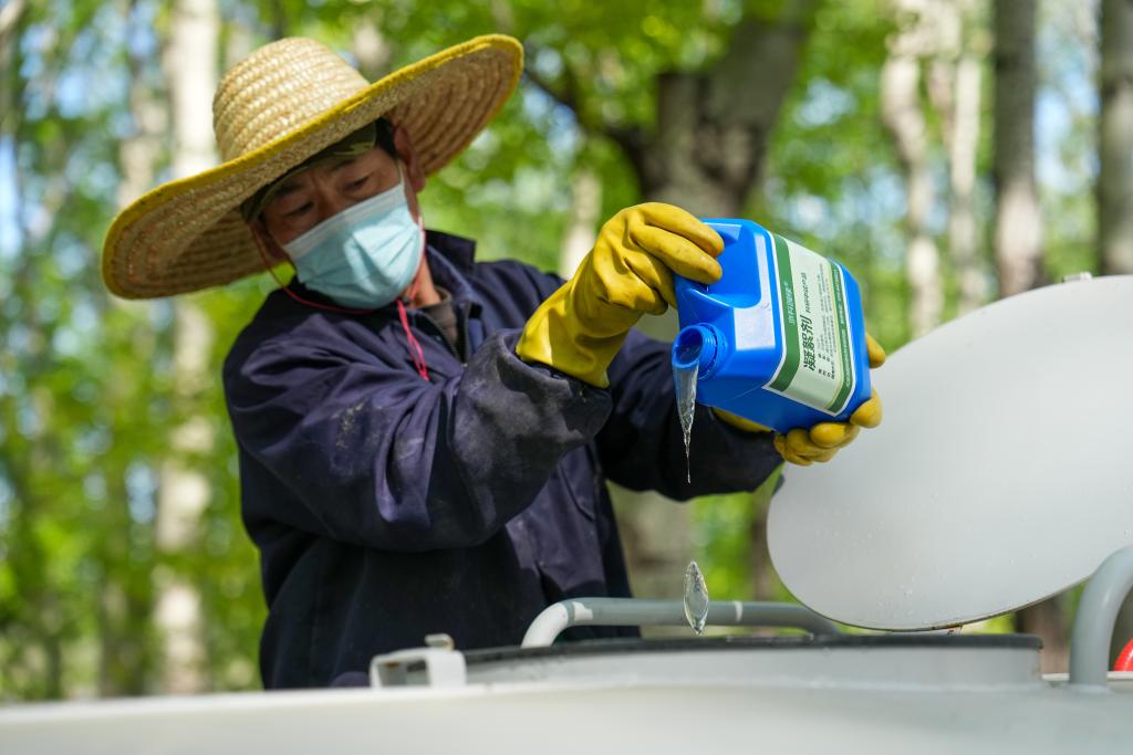 4月11日,在北京奥林匹克森林公园,工作人员在用加入了凝絮剂的水喷洒杨树。新华社记者 鞠焕宗 摄