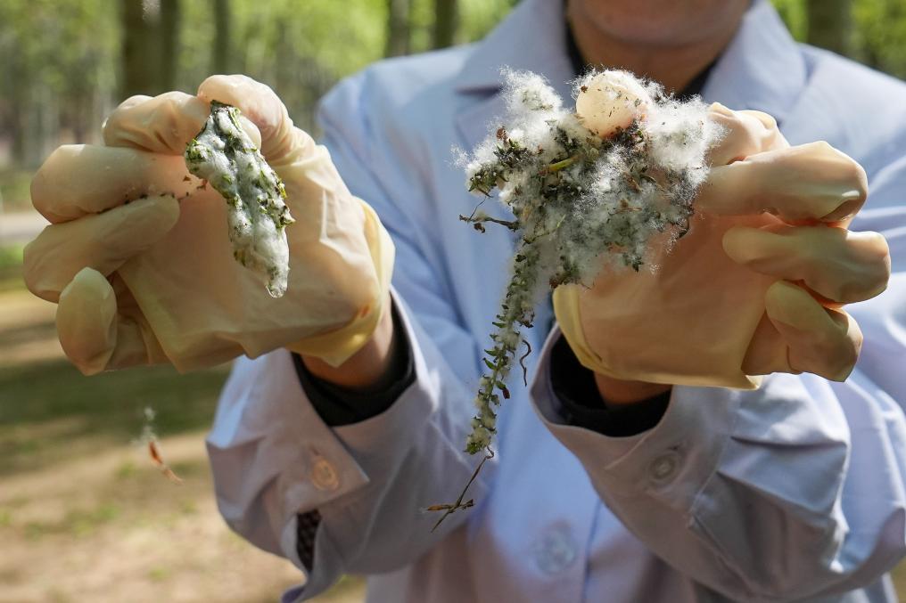 4月11日,在北京奥林匹克森林公园,一位工作人员在展示杨絮和被凝絮剂包裹后的杨絮对比。新华社记者 鞠焕宗 摄