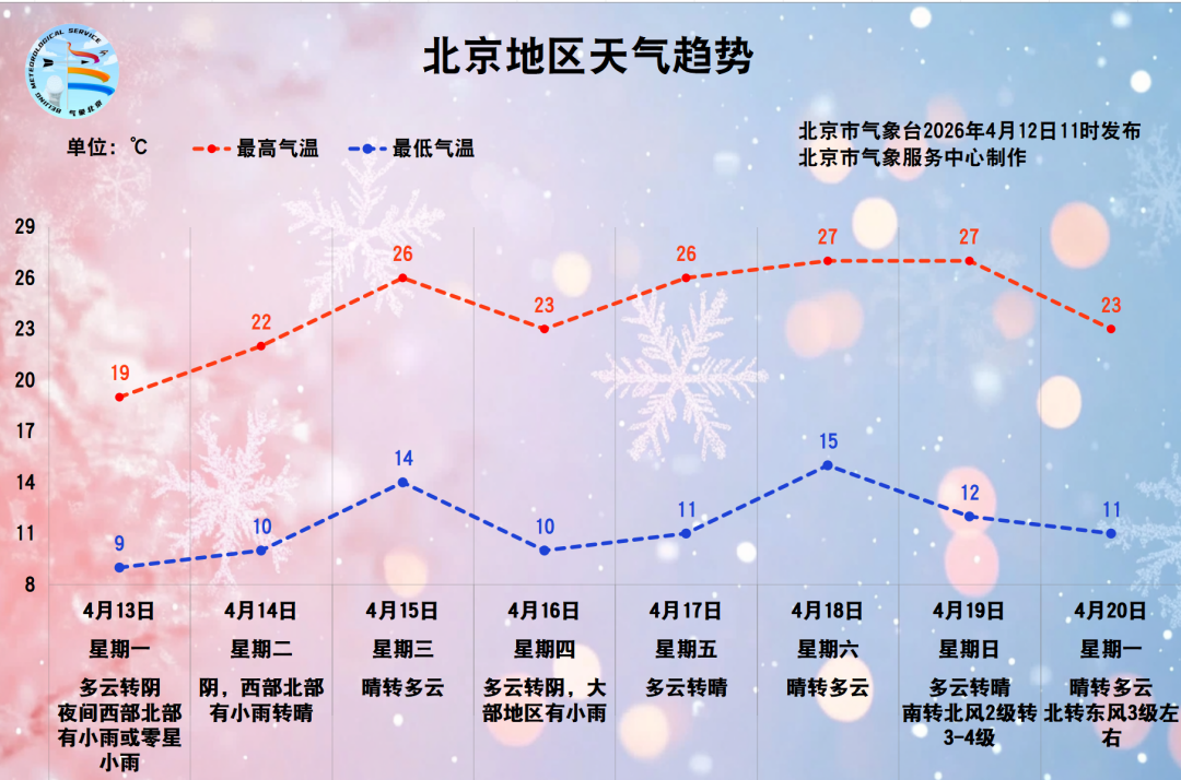 2026年4月13日至4月20日白天最高气温19~27℃,夜间最低气温9~15℃。
