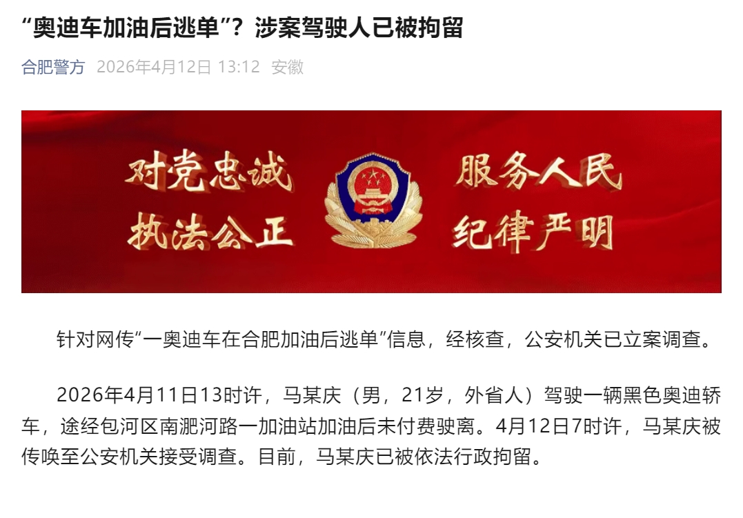 针对网传“一奥迪车在合肥加油后逃单”信息,经核查,公安机关已立案调查。