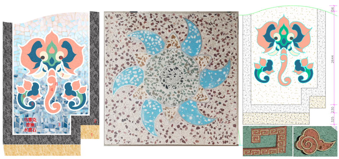 象身拼花脱胎于景泰蓝工艺,工匠用扁钢丝掐出繁复纹样,精准填入不同色阶水磨石材料,凝固后多遍打磨抛光,搭配2mm不锈钢条镶边,让拼花严丝合缝。打磨抛光贯穿全程,手工精磨凸显水磨石原生肌理,象鼻滑道做超高光滑度处理,兼顾质感与滑行体验。