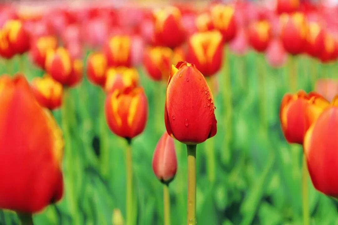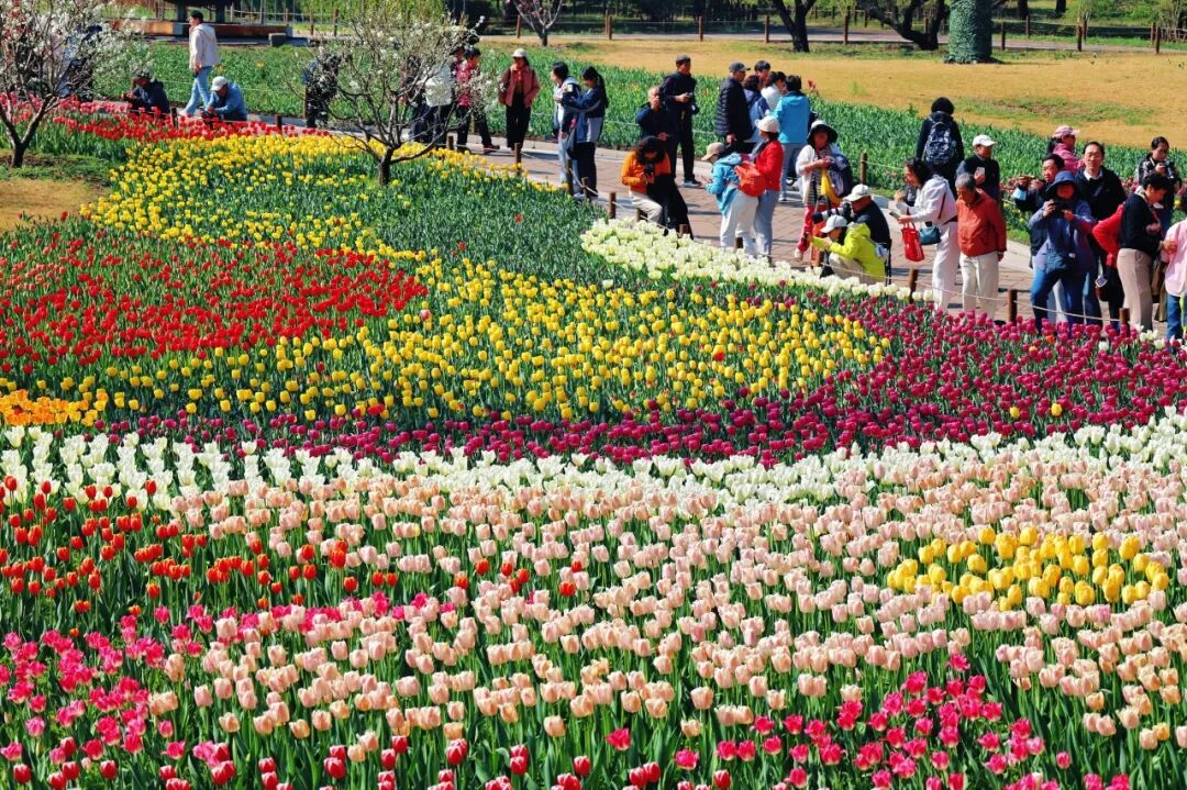 红的、黄的、紫的、白的,郁金香成片成片地开着,像谁打翻了调色盘,顺着地势流淌开来。