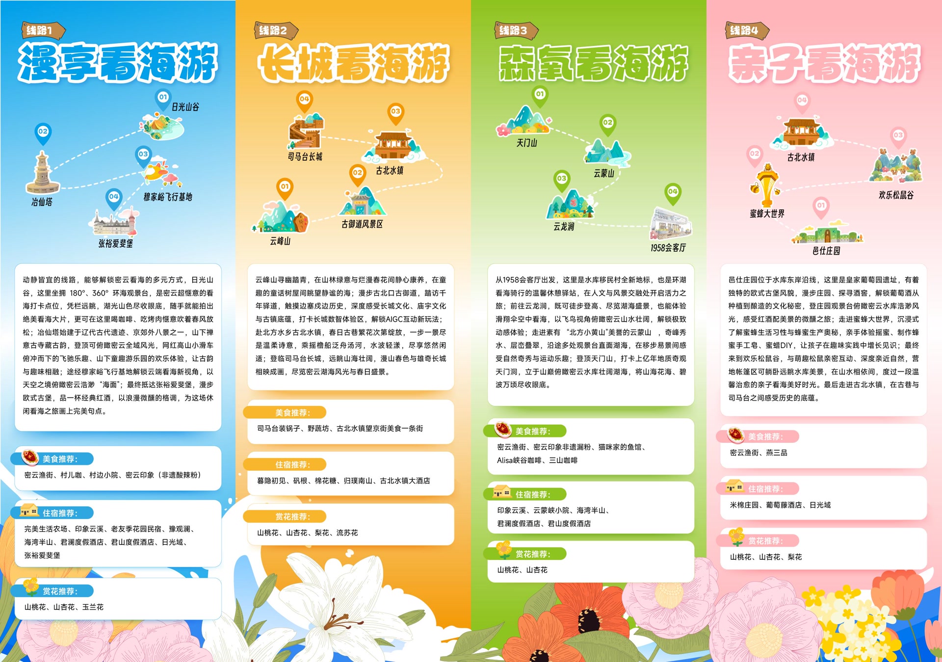 以日光山谷、云蒙山、云峰山、邑仕庄园四大特色“看海”点位为核心,密云串联起古北水镇、司马台长城、蜜蜂大世界、云龙涧等周边特色文旅资源,打造了四条特色鲜明的“看海”主题旅游线路,游客可选择直升机、滑翔伞、环湖自驾或骑行等多种方式,从不同视角邂逅密云山水,体验休闲、户外、康养、亲子等多元微度假场景。