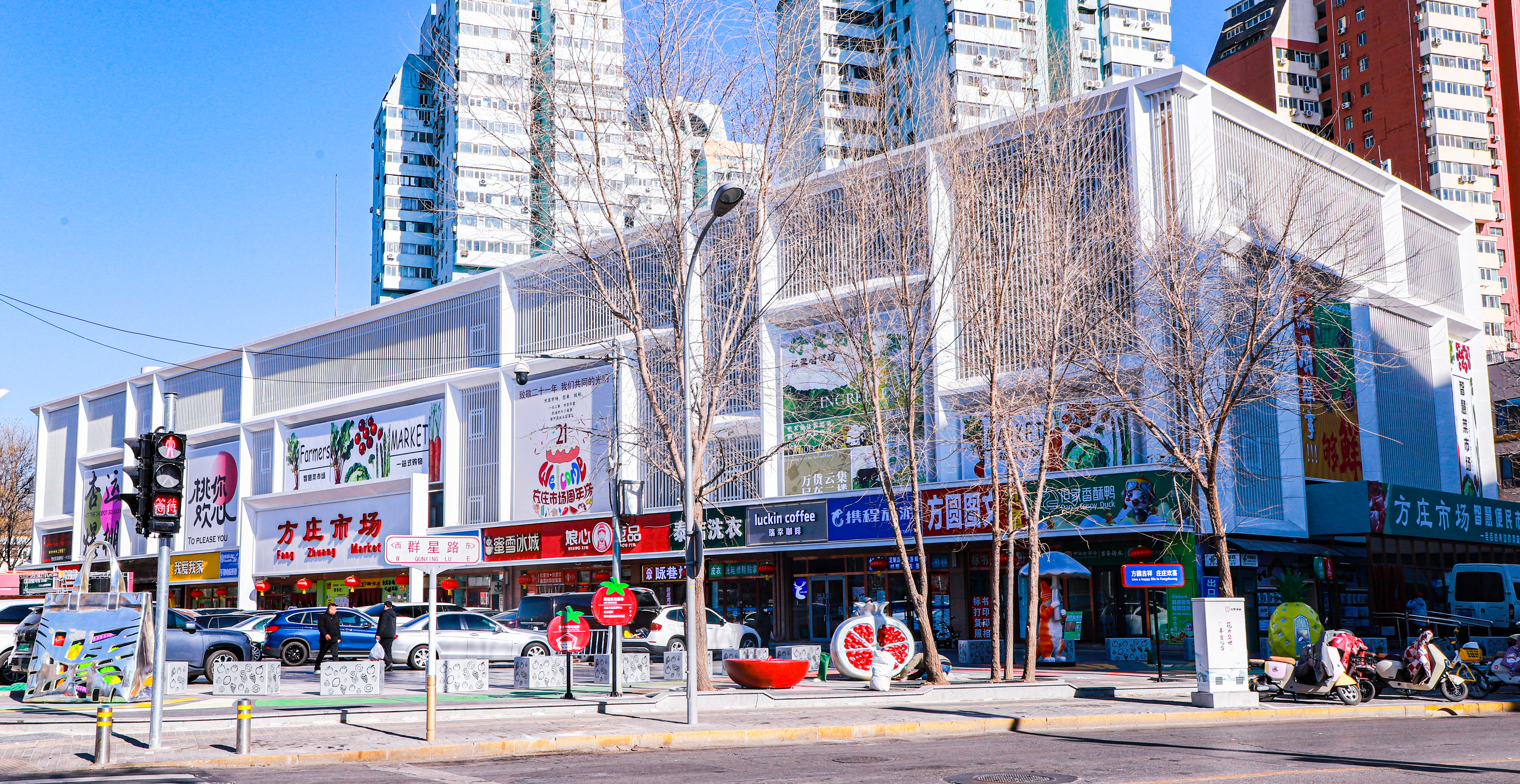 从南三环方庄桥向北,过一个红绿灯,右手处就是方庄市场。刚刚完成升级的白色格栅外墙,“幸运爆棚”“桃你欢心”“好食材汇聚咱市场”的巨幅招贴画,透着时尚。靠着路口的一侧,是新升级的互动空间,一人多高的“购物袋”,橘子形状的座椅,半人多高的“石榴”雕塑……有年轻人在拍照打卡,有老人带着孩子在这里玩耍。