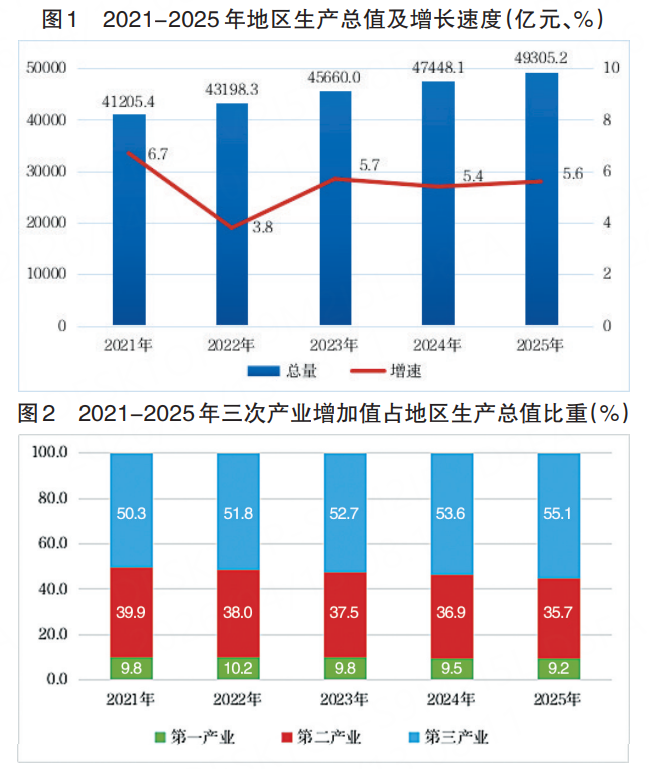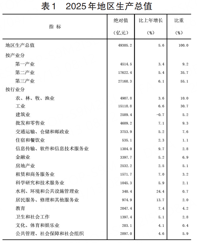 初步核算,全年地区生产总值49305.2亿元,比上年增长5.6%,增速居全国第3位。其中,第一产业增加值4514.5亿元,增长3.4%;第二产业增加值17622.4亿元,增长5.4%;第三产业增加值27168.3亿元,增长6.1%。第一产业增加值占地区生产总值比重为9.2%,第二产业增加值比重为35.7%,第三产业增加值比重为55.1%。全年人均地区生产总值66936元,比上年增长5.8%。