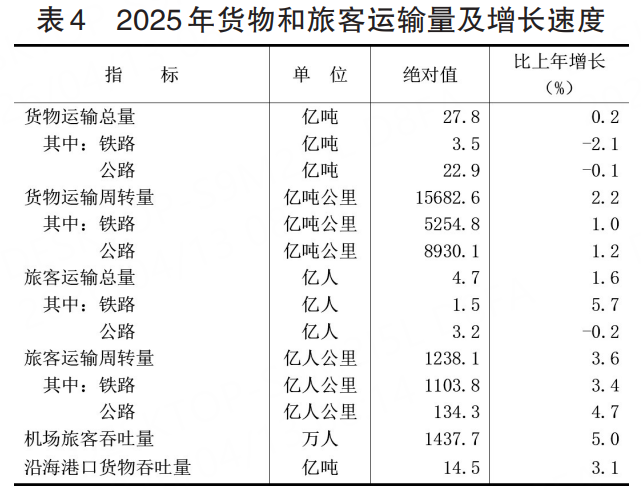 全年货物运输总量27.8亿吨,比上年增长0.2%;货物运输周转量15682.6亿吨公里,增长2.2%。旅客运输总量4.7亿人,增长1.6%;旅客运输周转量1238.1亿人公里,增长3.6%。机场旅客吞吐量1437.7万人,增长5.0%。沿海港口货物吞吐量14.5亿吨,增长3.1%。
