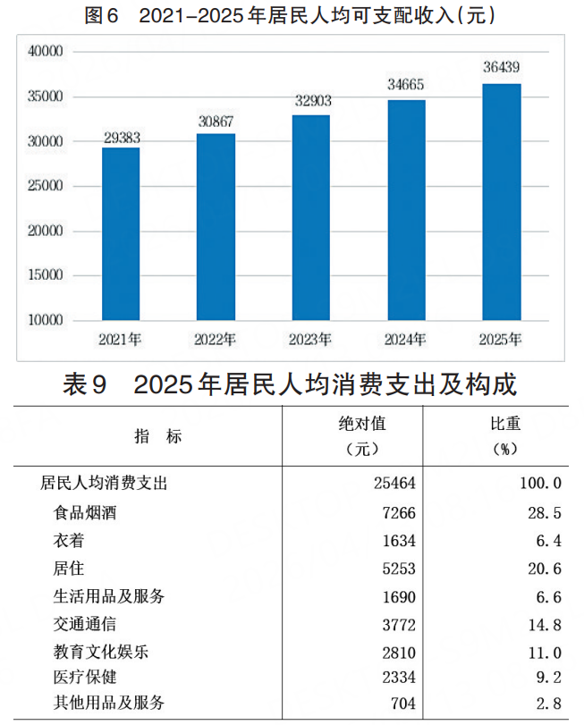 全年居民人均可支配收入36439元,比上年增长5.1%,增速居全国第10位。按常住地分,城镇居民人均可支配收入47544元,增长4.2%;农村居民人均可支配收入23319元,增长5.9%。城乡居民人均可支配收入比值为2.04,比上年缩小0.03。全年居民人均消费支出25464元,比上年增长5.0%。按常住地分,城镇居民人均消费支出30522元,增长4.1%;农村居民人均消费支出19488元,增长5.8%。全年居民恩格尔系数为28.5%,比上年下降0.1个百分点。其中,城镇居民恩格尔系数为27.5%,农村居民恩格尔系数为30.5%。
