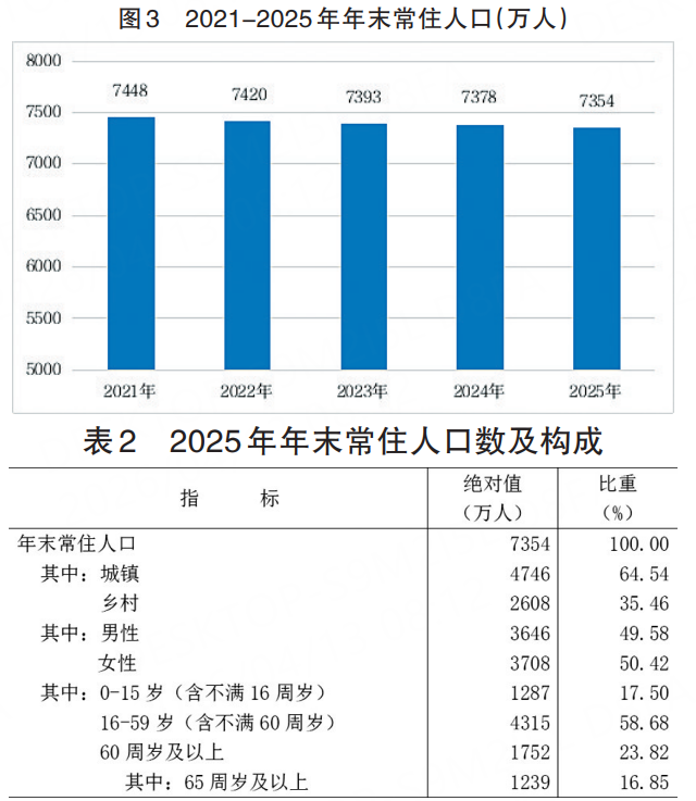 年末常住人口7354万人,比上年末减少24万人。常住人口城镇化率为64.54%,比上年末提高1.12个百分点。全年出生人口36万人,出生率为4.89‰;死亡人口63万人,死亡率为8.48‰;人口自然增长率为-3.59‰。扣除自然增长,净流入3万人。