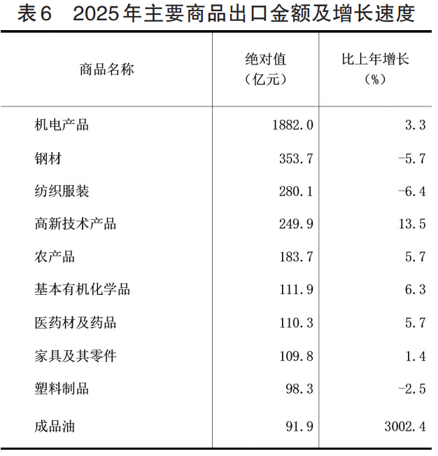 新质生产力加快发展。全年规模以上工业战略性新兴产业增加值比上年增长11.0%;高新技术产业增加值增长11.3%,占规模以上工业比重为25.5%。规模以上工业九大主导产业中,新能源增长13.4%,新一代信息技术增加值增长11.6%,高端装备增长10.9%,先进钢铁增长9.6%,健康食品增长7.0%,生物医药增长6.7%,现代轻纺增长6.3%,绿色化工增长5.1%,新材料增长4.3%。全年高技术产业投资比上年增长21.4%。全年网上零售额5100.6亿元,比上年增长8.9%。全年新登记经营主体113.35万户,截至2025年底,经营主体924.17万户,其中企业289.78万户。