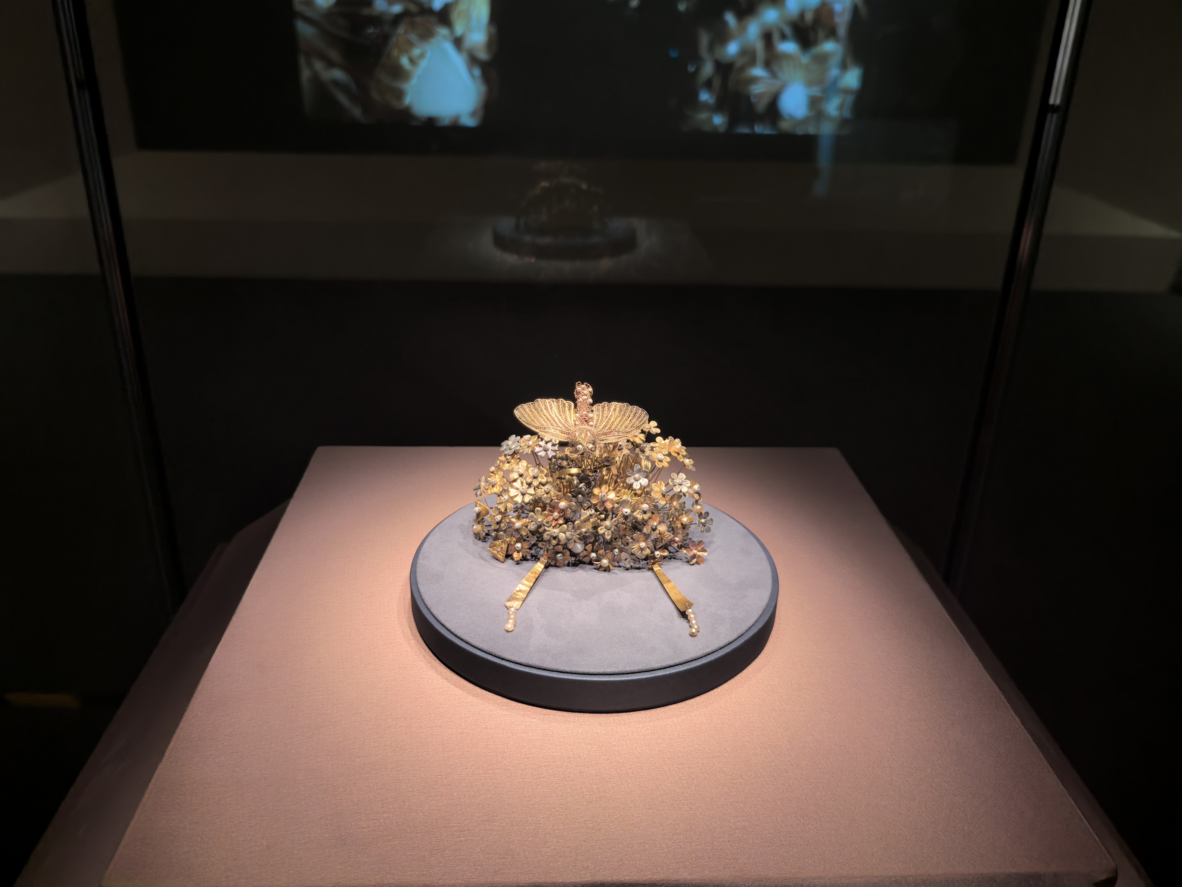 “这是钗,不是冠。”策展人特意解释,这次配套展出了钗脚残件。让观众可以更直观地了解金钗佩戴方式。“开展以来,有些人为了看到金钗花丛、飞蛾颤动的瞬间,会跺脚,甚至拍展柜玻璃,这种做法不利于文物安全,也呼吁观众文明观展。”