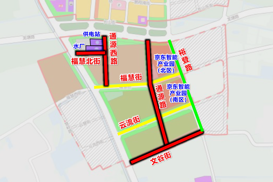 与福慧街(木孙路—裕登路)相连的通源路(文谷街—龙塘路),正全力推进雨水方涵浇筑作业。作为园区内重要的十字形道路,两条路共同构成园区核心道路骨架。园区周边的裕登路(文谷街—龙塘路)、通源西路(福慧街—龙塘路)、云流街(木孙路—裕登路)也在同步施工。五条道路完工后,不仅能为京东智能产业园提供坚实的交通支撑,完善区域路网衔接,更能补齐市政配套短板,为园区高效运转筑牢基础。