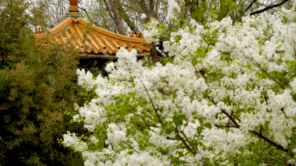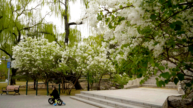 走进顺义公园,丁香与碧水、亭台相映成趣。高台仙阁前,白色丁香素雅如雪,紫色丁香淡若烟霞,簇拥着飞檐斗拱,古意盎然。穿过一座玲珑的小桥,桥下流水潺潺,两岸丁香低垂,倒影随波轻漾。