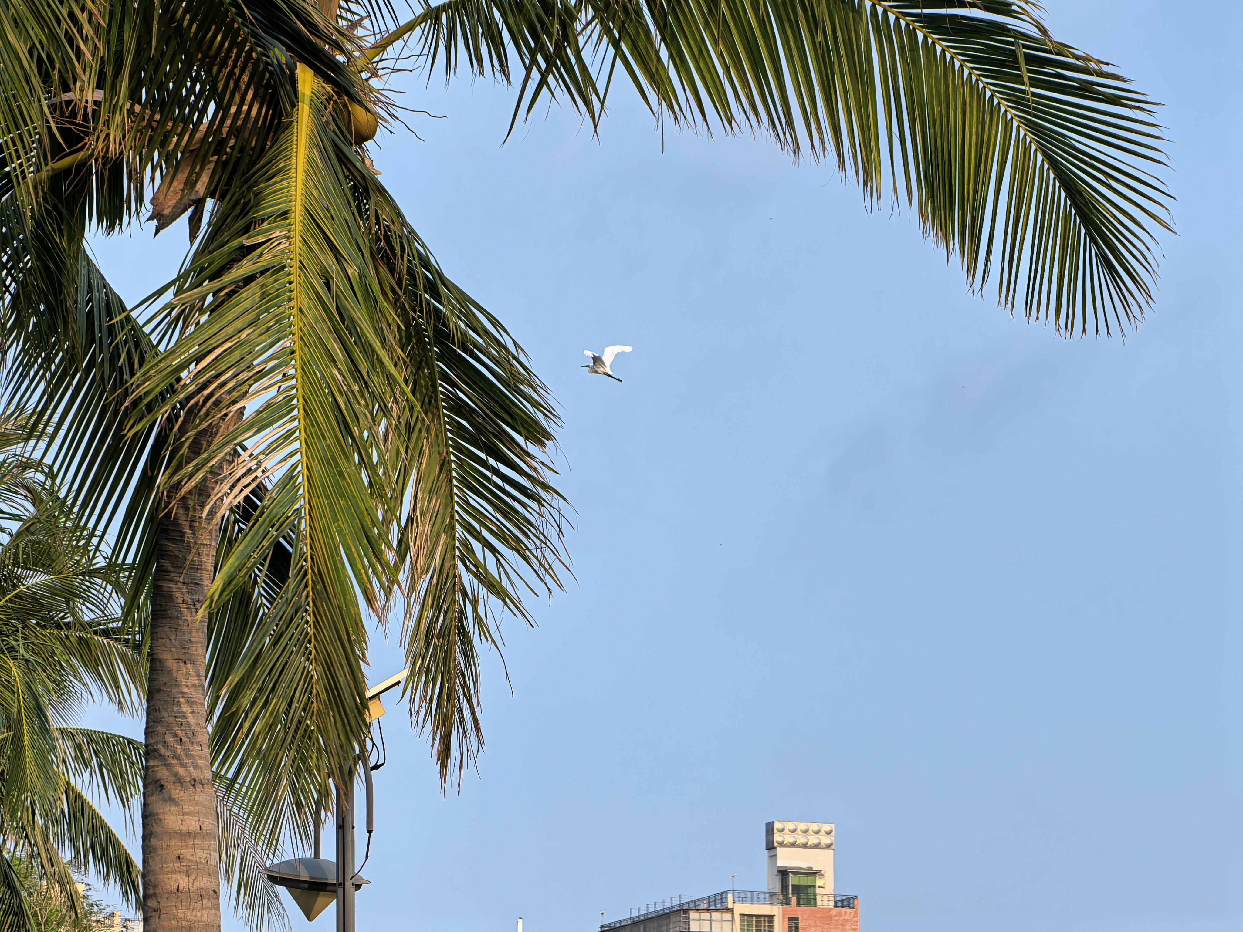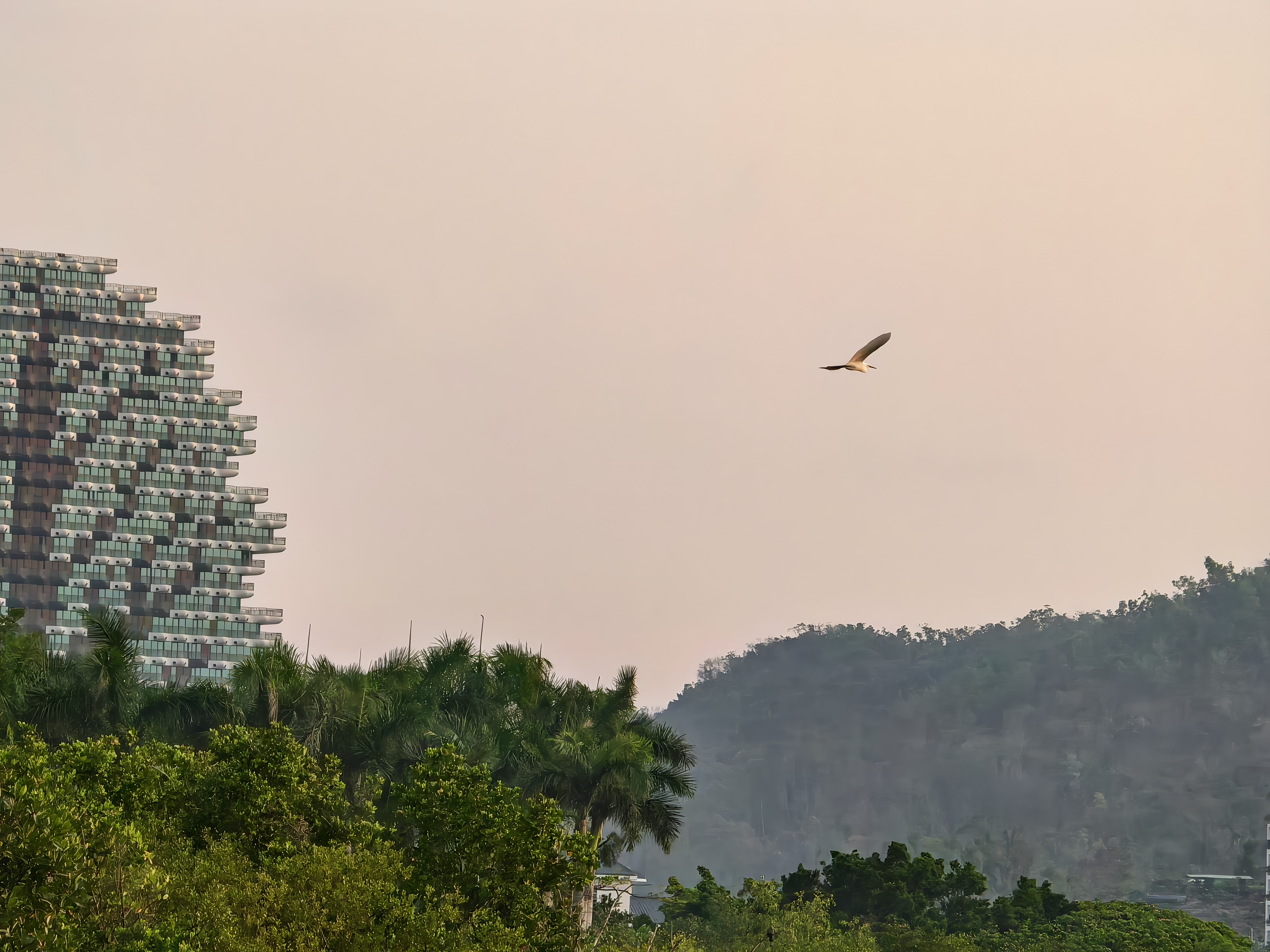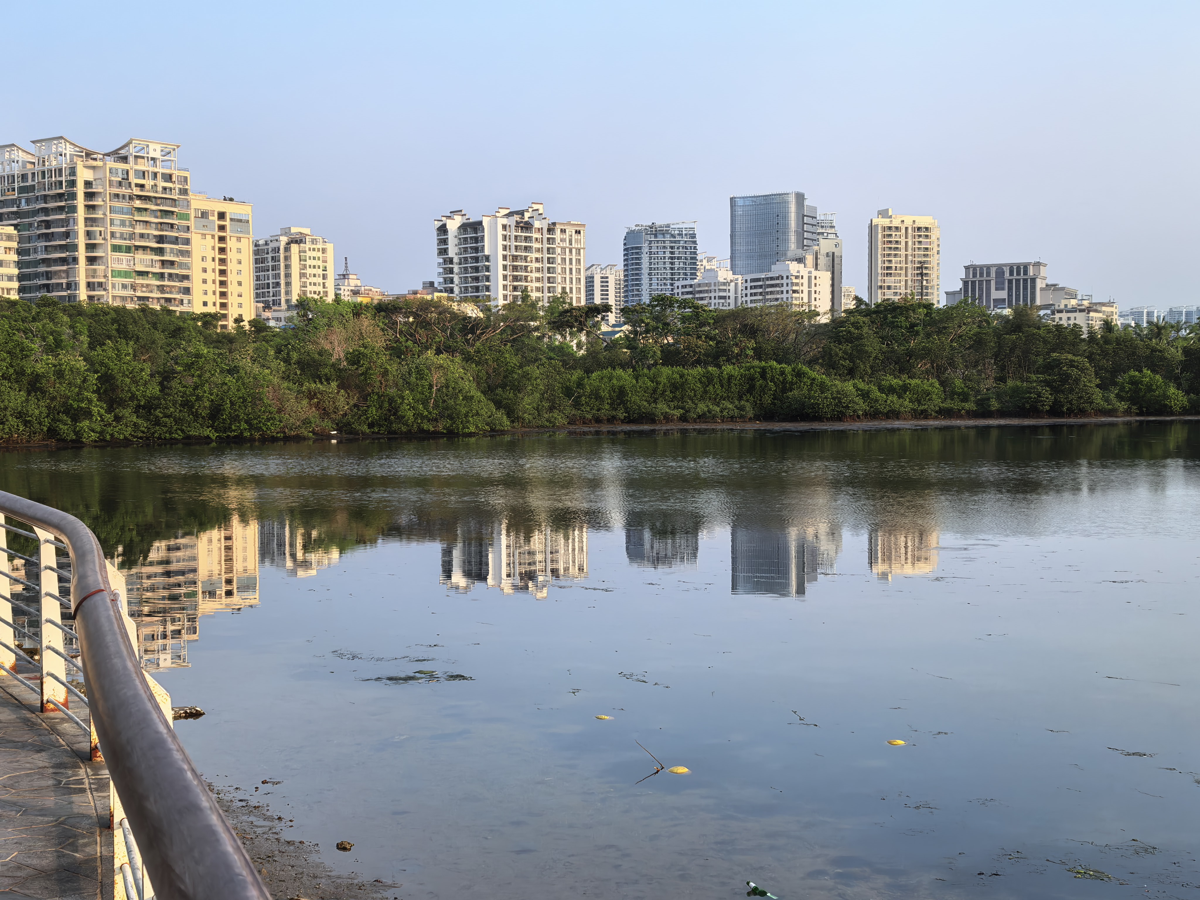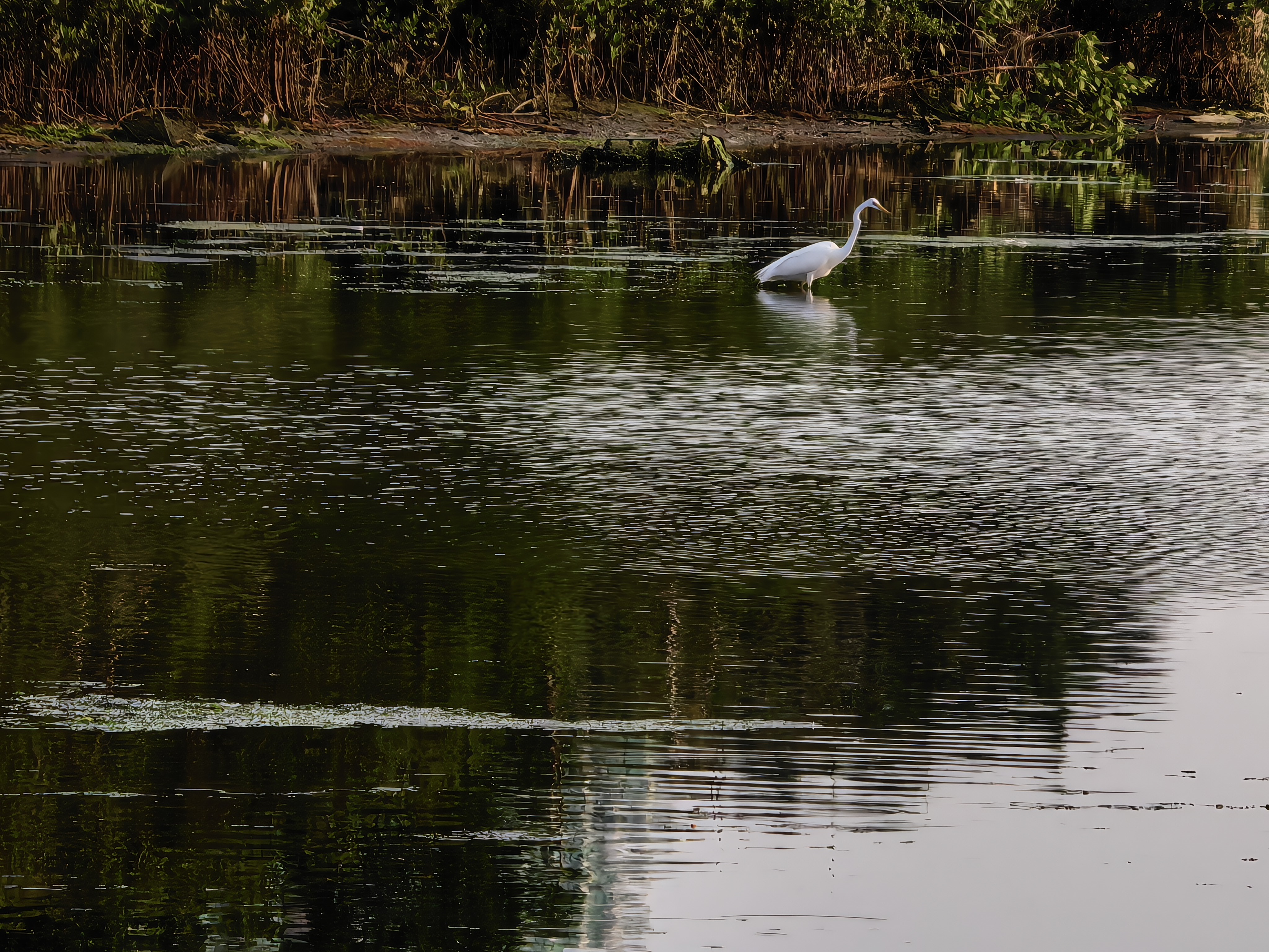 公园不大,占地不过二十五七公顷的样子,却自有一番格局。沿着湖边的栈道往里走,果然,那传说中白鹭最多的几片红树林,树冠上空空荡荡的,只有枝叶在晨风里微微摇晃。几只白鹭远远地立在浅滩上,懒洋洋地缩着脖子,像是在打盹。我心里越发懊悔——那些成群结队掠过水面、如诗如画的景象,怕是看不到了。