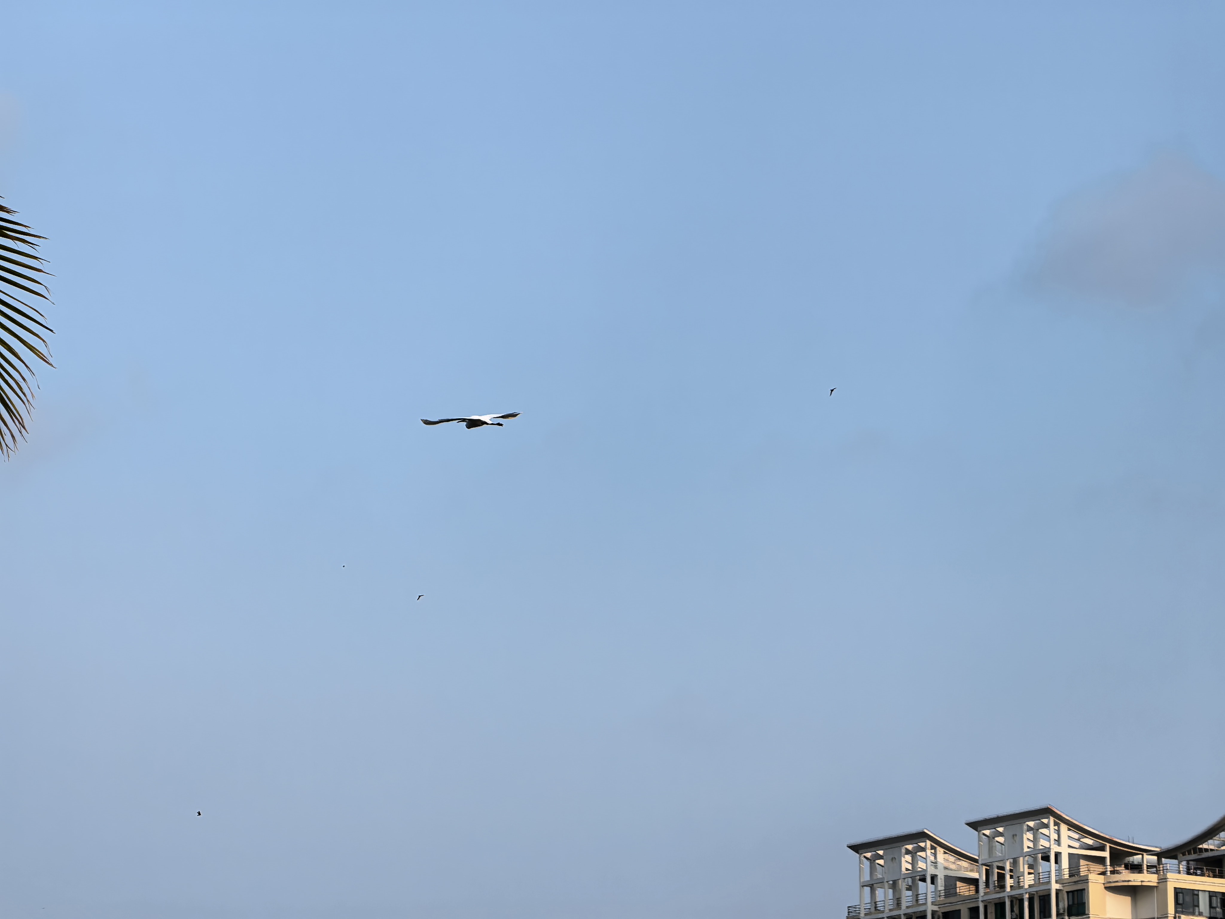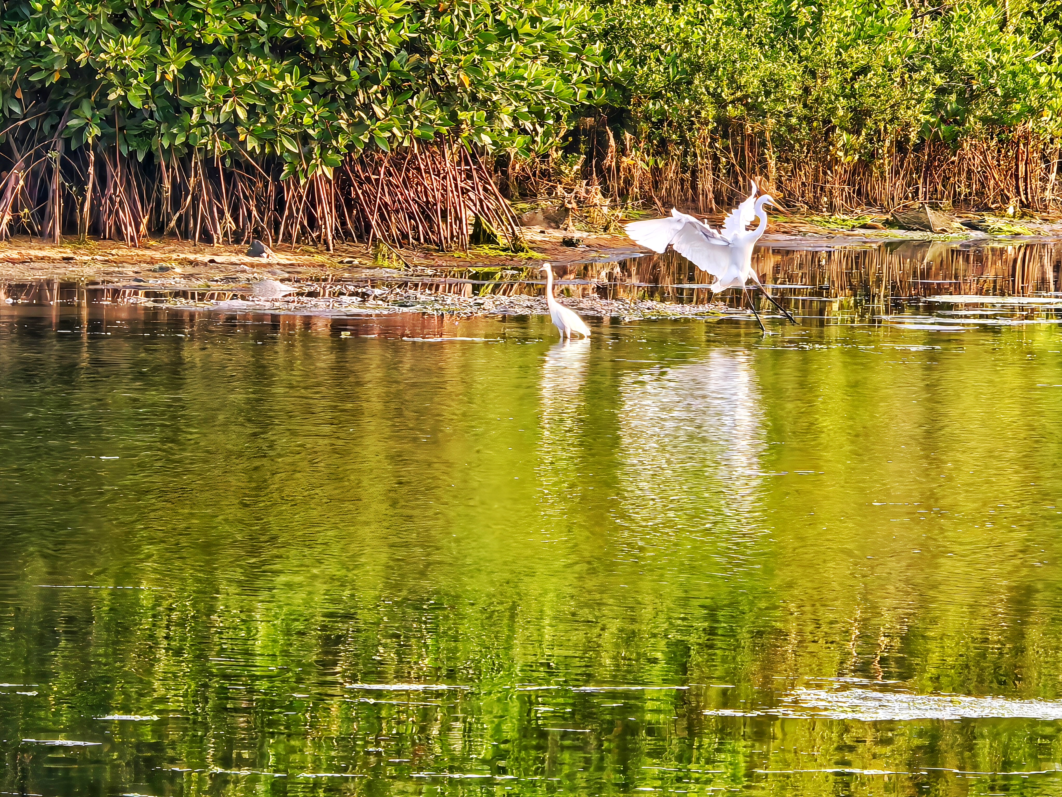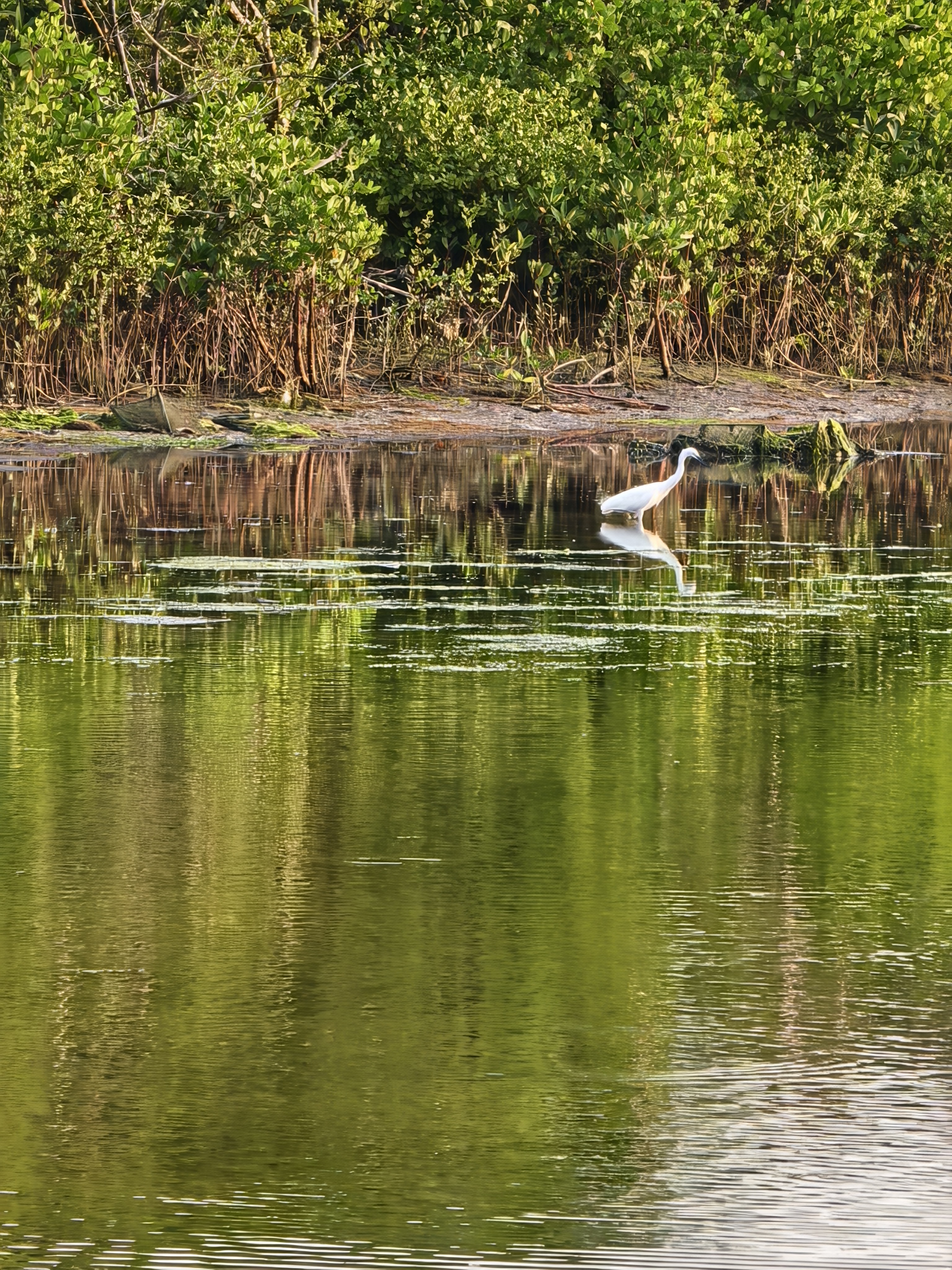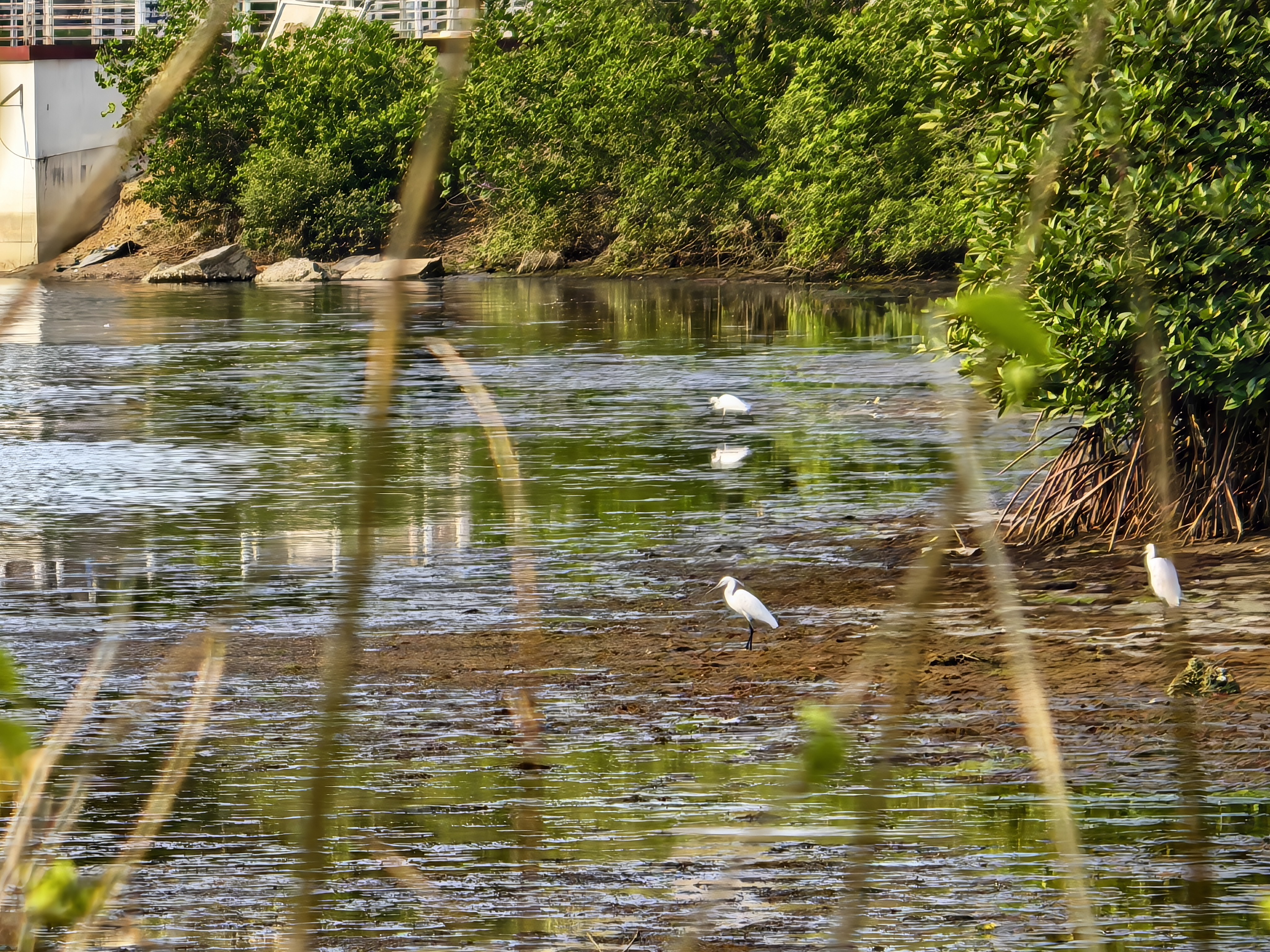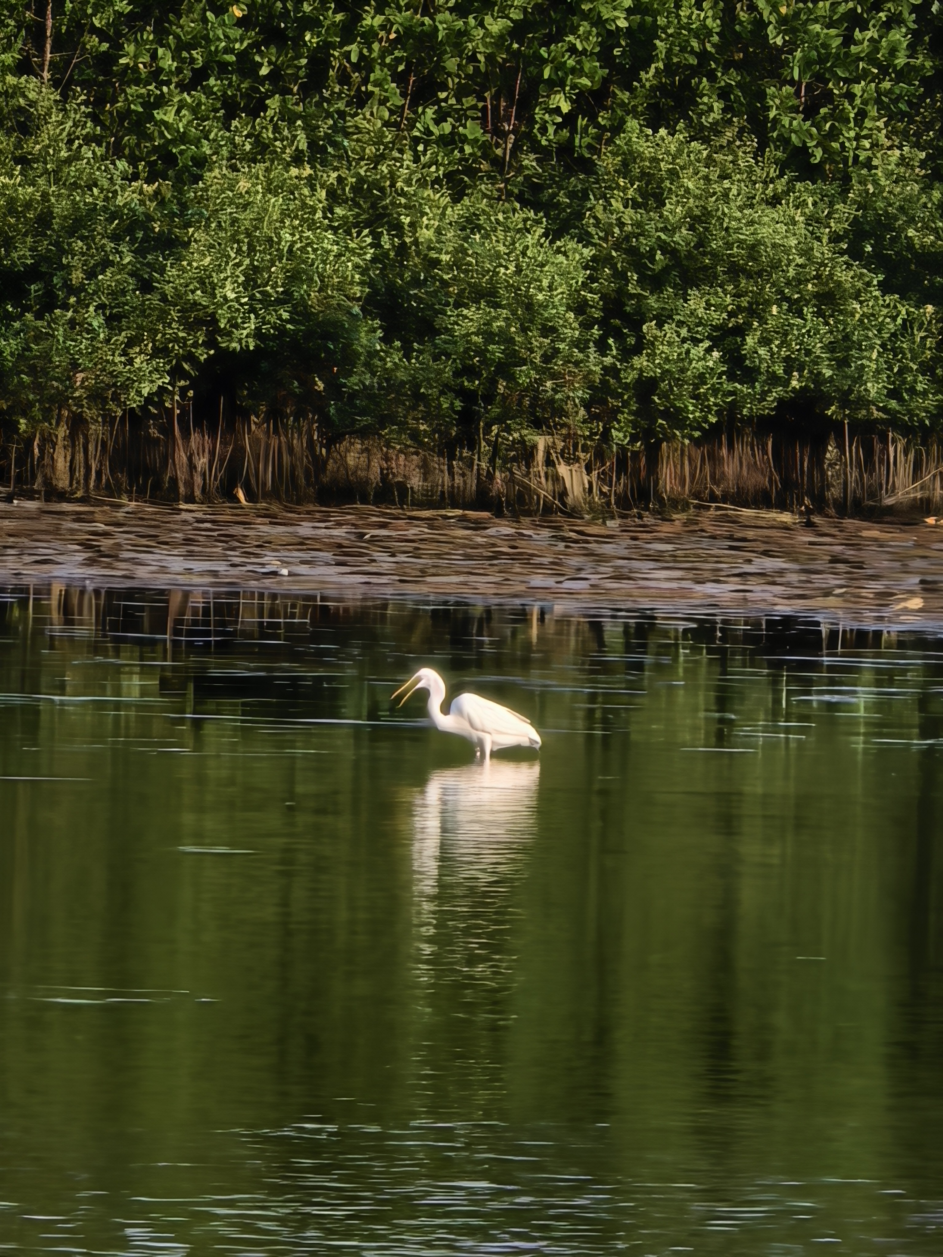 远处的红树林里,还有几只白鹭站在树冠顶上。它们在阳光下显得格外白,白得几乎要发光。背后的树是深绿色的,衬着这些白点,像一幅意境悠远的水墨画。只是画家的笔触再精妙,也画不出它们偶尔扇动翅膀时,那一瞬间的灵动。