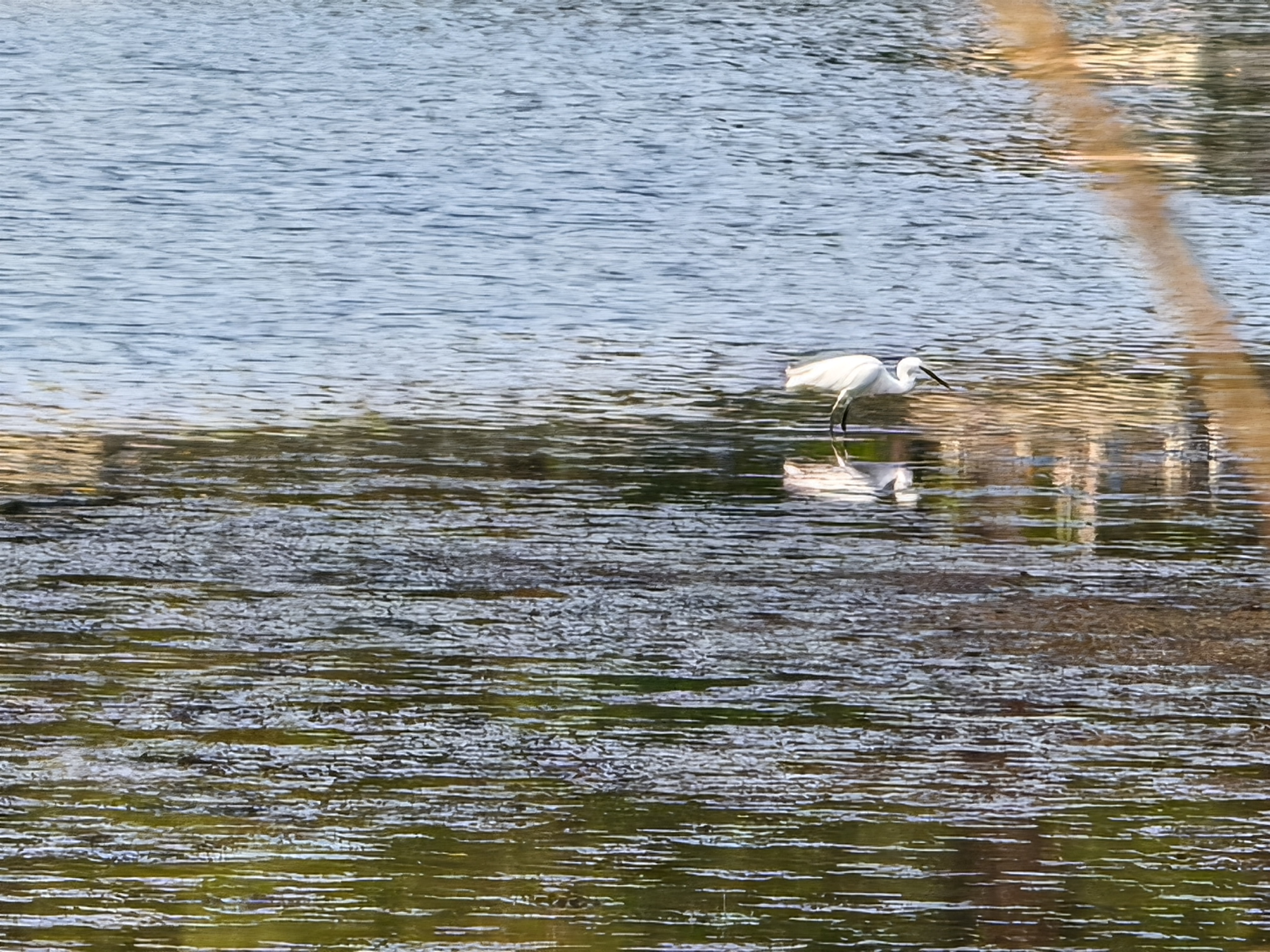 这白鹭,羽毛白得像新雪,修长的脖子时而伸直,时而弯成一道优雅的弧线。有一只格外有趣,它不跟同伴们待在一起,而是独自站在一块凸出水面的石头上,歪着头,像在想什么心事。偶尔有一只蜻蜓飞过,它的头会跟着转动,但身子依然纹丝不动,那模样,像个好奇的孩子。