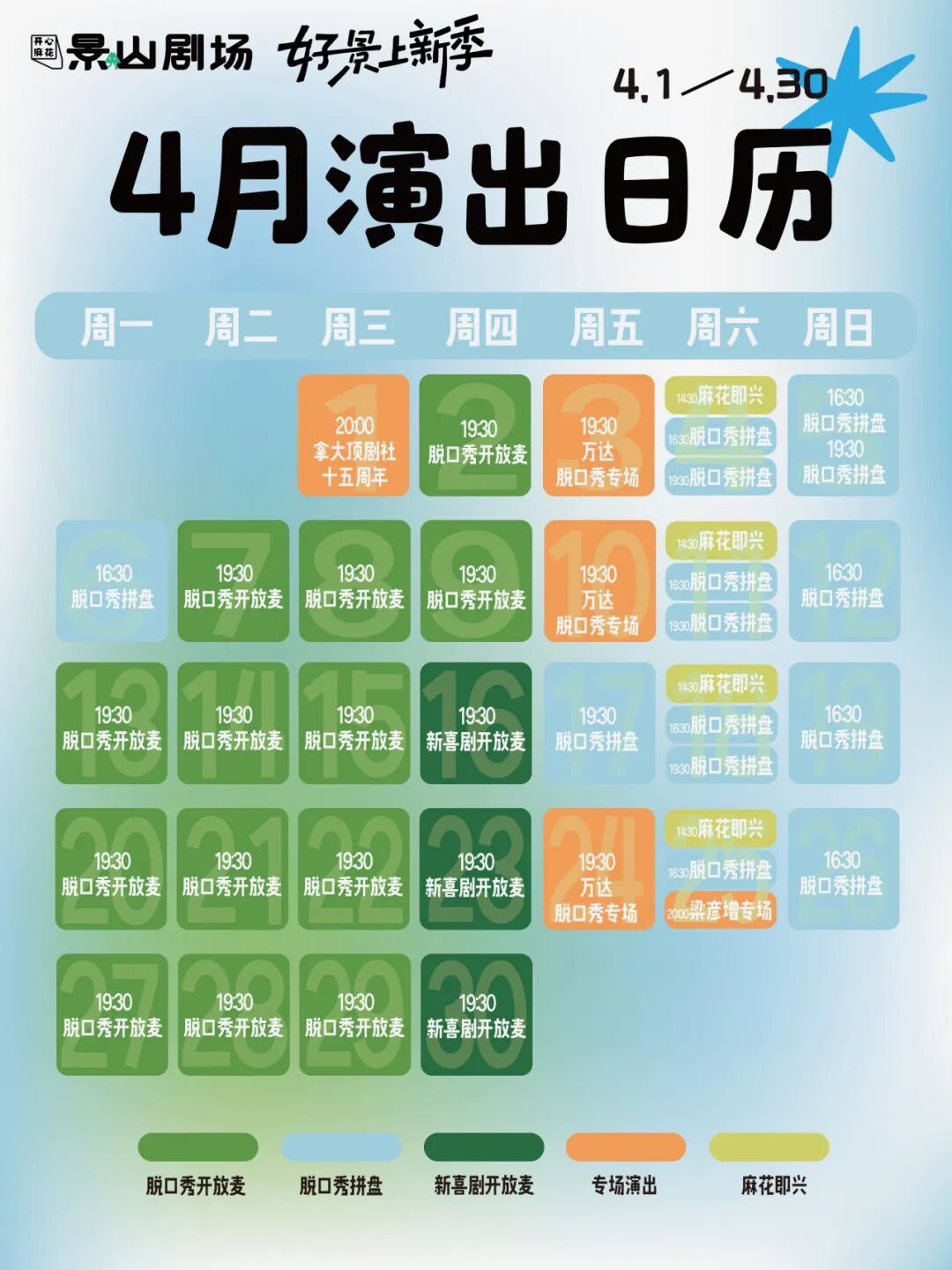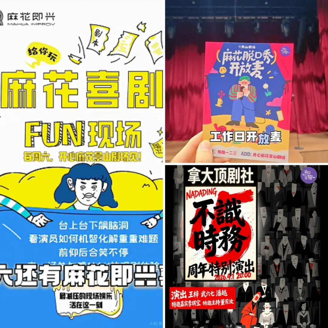 伴随剧场正式运营,4月演出日历已全面上线,一场场满含欢笑与创意的文艺盛宴华彩绽放——每周五至周日汇聚各类脱口秀形式,实力演员轮番炸场,笑点密集、氛围感拉满;工作日开放麦常态化开启,花样包袱随机掉落、新鲜爆梗持续输出,为观众带来即兴欢乐;每周六专属麻花即兴喜剧专场,每场演出都如同开盲盒,不确定性的惊喜让喜剧迷直呼“闭眼冲”。