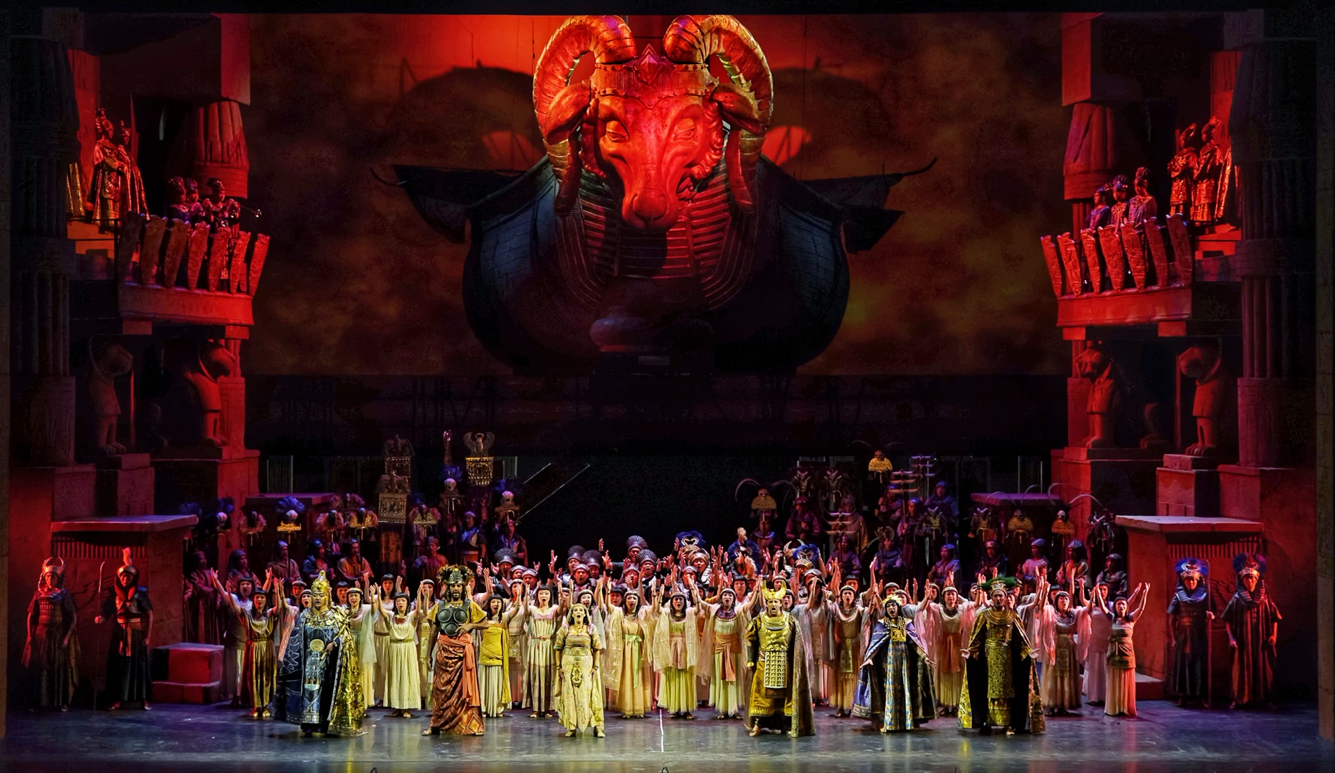 国家大剧院版《阿依达》首演于2015年,于今年4月迎来第四轮复排。演出阵容上,指挥家平夏斯·斯坦伯格现场执棒,玛丽亚·特蕾莎·莱、豪尔赫·德·莱昂领衔出演,与国家大剧院歌剧演员队、合唱团、管弦乐团、辽宁芭蕾舞团共同呈现了这部威尔第巅峰之作。依托中影集团全国唯一的影院直播技术基建,4K超高清信号从北京出发,实时传输至全国各地的合作场馆。在影剧院的大屏幕上,观众可以清楚地看到高达9米的埃及神庙、几乎顶满纵向空间的“羊头”战船、月光下波光粼粼的尼罗河等种种舞台细节。