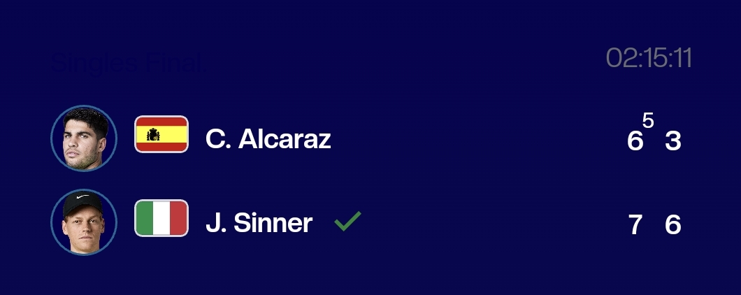 比赛首盘通过“抢七局”,辛纳在抢七局中以7比5拿下。第二盘,辛纳盘中连下五局后拿下,从而以2比0战胜阿尔卡拉斯,夺得冠军。值得一提的是,辛纳近期豪取17连胜,状态十分火热。此役过后,辛纳将在积分榜上反超阿尔卡拉斯,重新登顶世界第一。