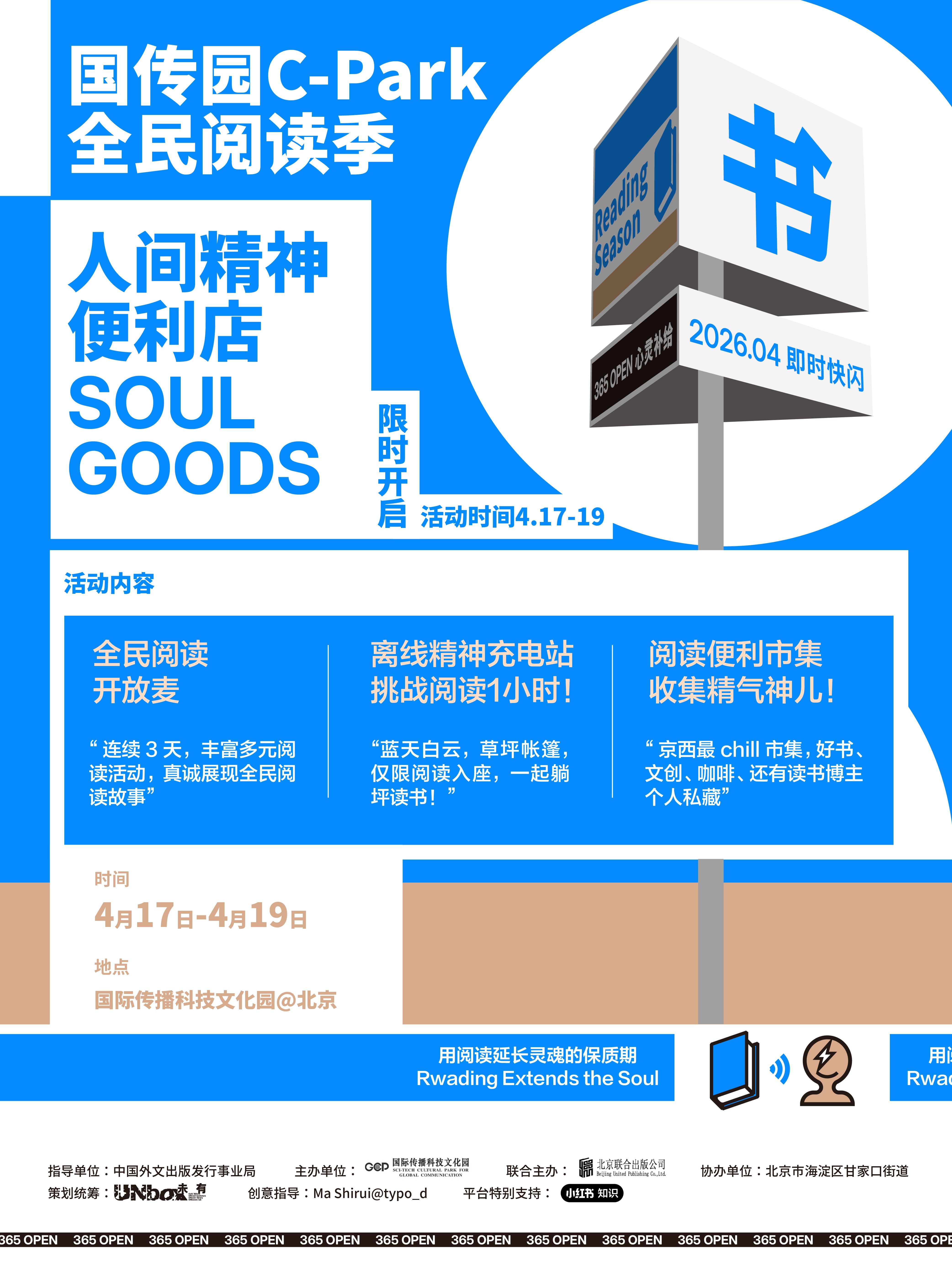 据介绍,“国传园C-Park全民阅读季”将于4月17日带来一场别开生面的开幕式,来自出版行业的作者、读者代表等将参与“全民阅读开放麦”。“人间精神便利店”主题线下活动将持续3天,现场设有“离线精神充电站”“阅读便利市集”“全民阅读开放麦”三大特色活动板块,读者可以在户外草坪躺“坪”读书,参与“离线阅读一小时”挑战,可以逛图书文创摊位,也可以参与丰富的阅读分享等活动。本次活动也获得了中国外文出版发行事业局指导、海淀区甘家口街道等单位的大力支持。