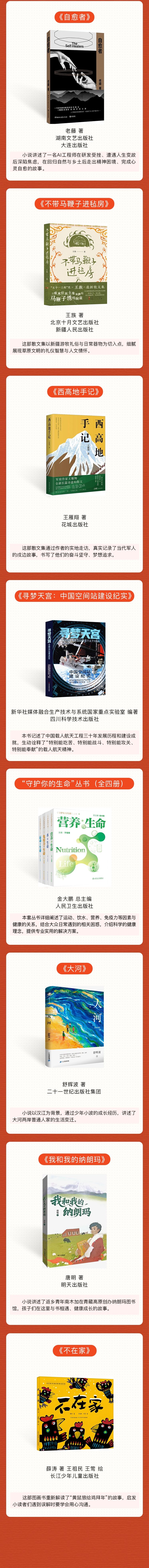 《中国式现代化与中华文明》、《前瞻“十五五”:跨进高收入社会的国际经验与中国战略》、《中国台湾简史》、《大国治沙》、《生命伦理》、《烟火深处:传统文化根脉在故乡》、《东坡在人间》、《自愈者》、《不带马鞭子进毡房》、《西高地手记》、《寻梦天宫:中国空间站建设纪实》、“守护你的生命”丛书(全四册)、《大河》、《我和我的纳朗玛》、《不在家》入选。